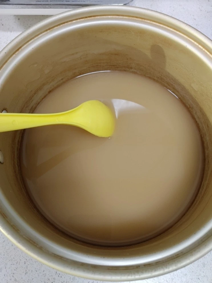 물과 한천가루를 섞어주다가 잠시 방치해둔다. 그러면 아래와 같이 팥 없는 양갱처럼 뭉쳐진다.