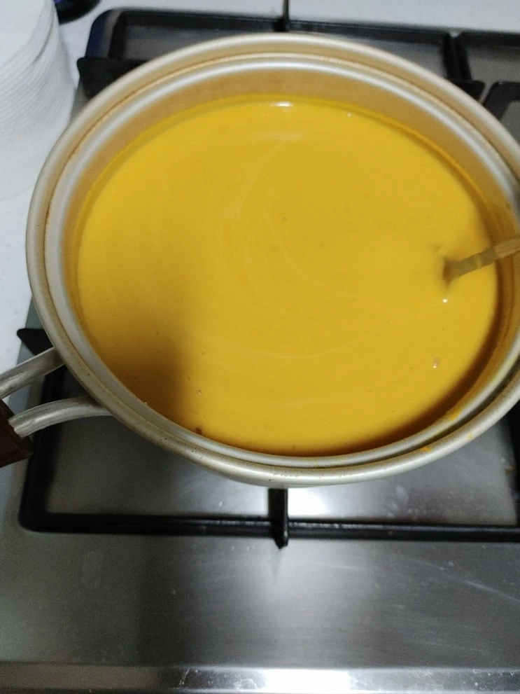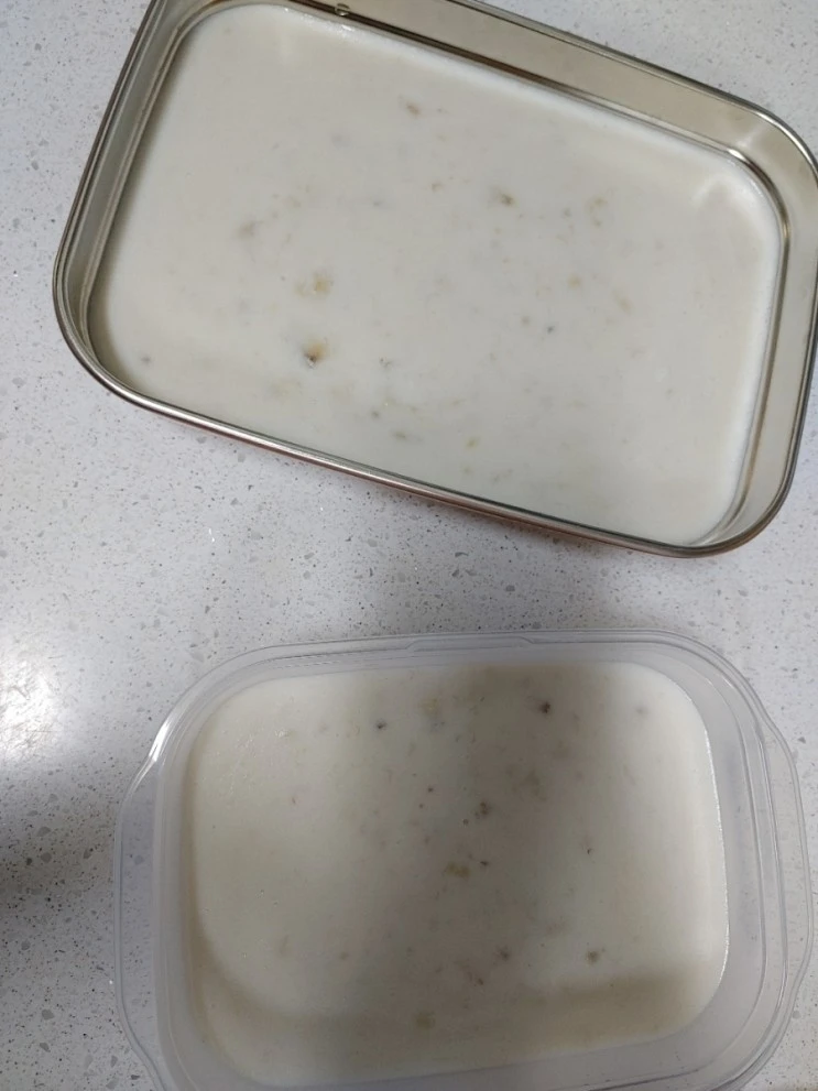 이제 냄비에 락토프리 우유를 넣고 저어주며 끓이다 불린 한천가루를 우유에 섞으며 더 끓인다. 그러다 더 추가해 주고 싶은 재료를 추가하고 좀 걸쭉해졌다 싶으면 불을 끈다.