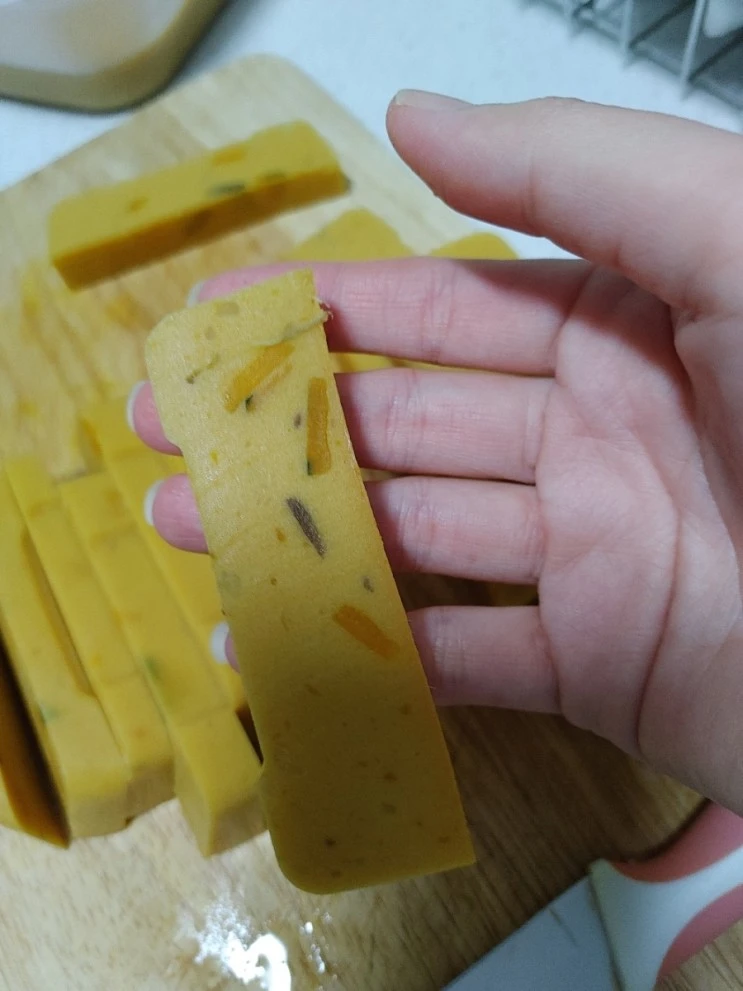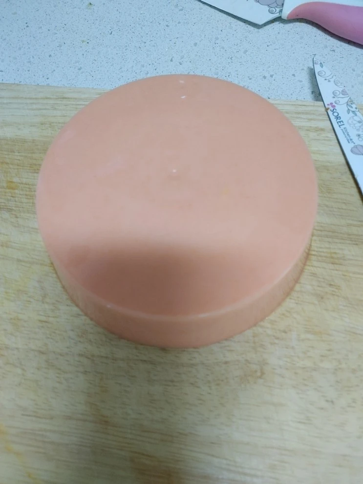 냉동실에서 2-3시간 후 꺼내보면 아래 사진처럼 탱탱한 푸딩으로 변해있다. 마치 대왕 분홍 소시지 같지만 저건 당근 우유 껌이 될 녀석이다.