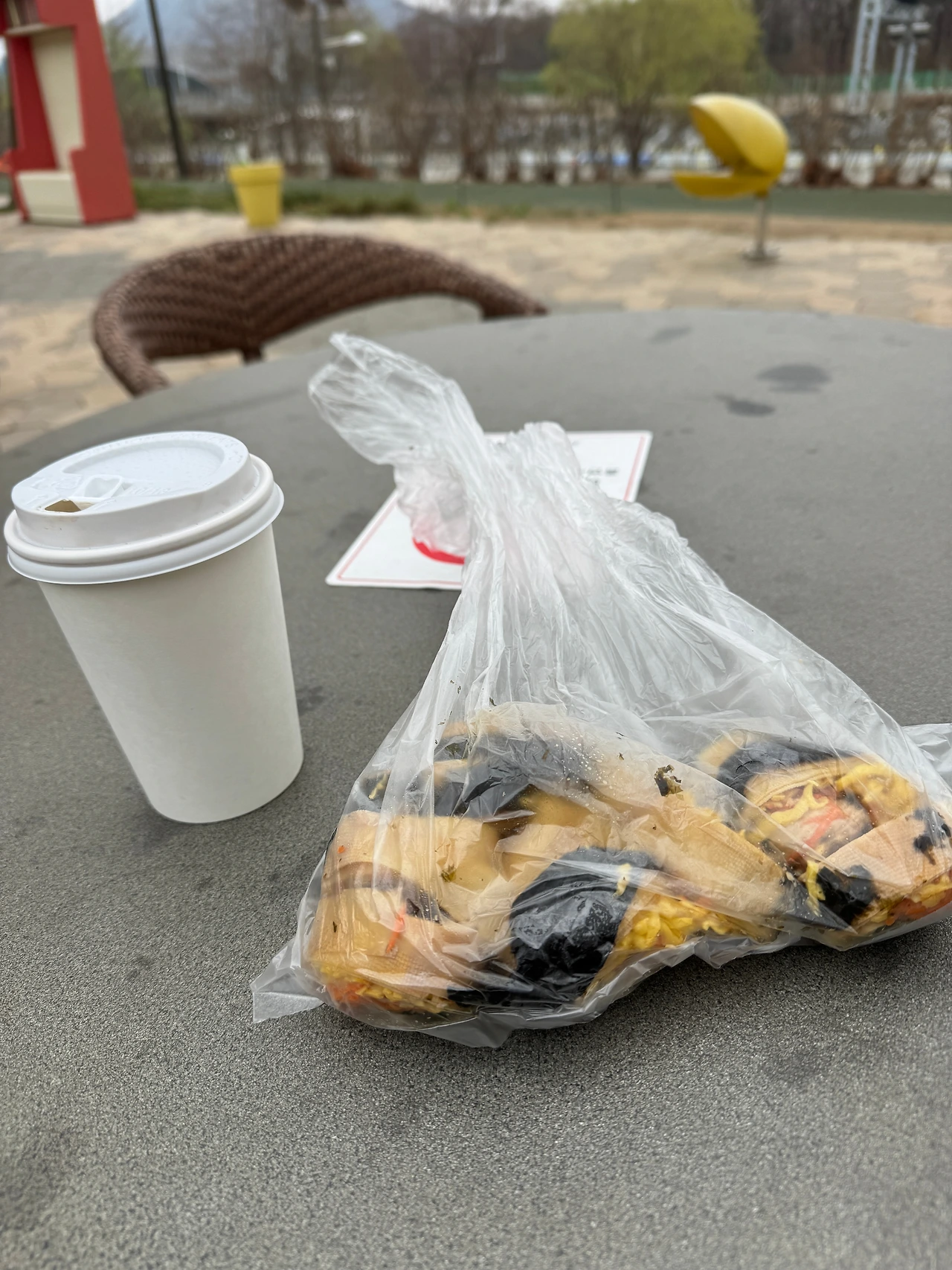 어제는 야외에서 컵라면을 먹었는데, 오늘은 김밥을 먹을 수 있을 것 같다.