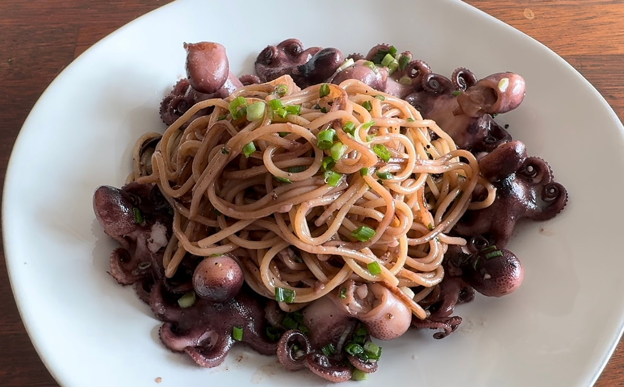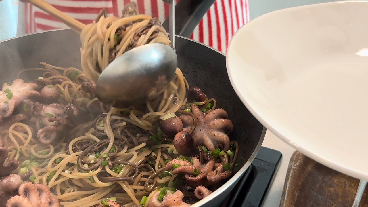 해동된 주꾸미가 마늘 올리브유에 잘 익으면 팬이 주꾸미에서 나온 육수로 흥건해진다. 그때 적당히 삶아 둔 스파게티면을 넣는다. 맛있는 육수가 스파게티면에 잘 스며들 수 있도록 불을 줄이지 않고 강불로 계속 익혀준다. 간장을 두 스푼 정도 둘러주고 나머지 간은 소금으로 더 한다.