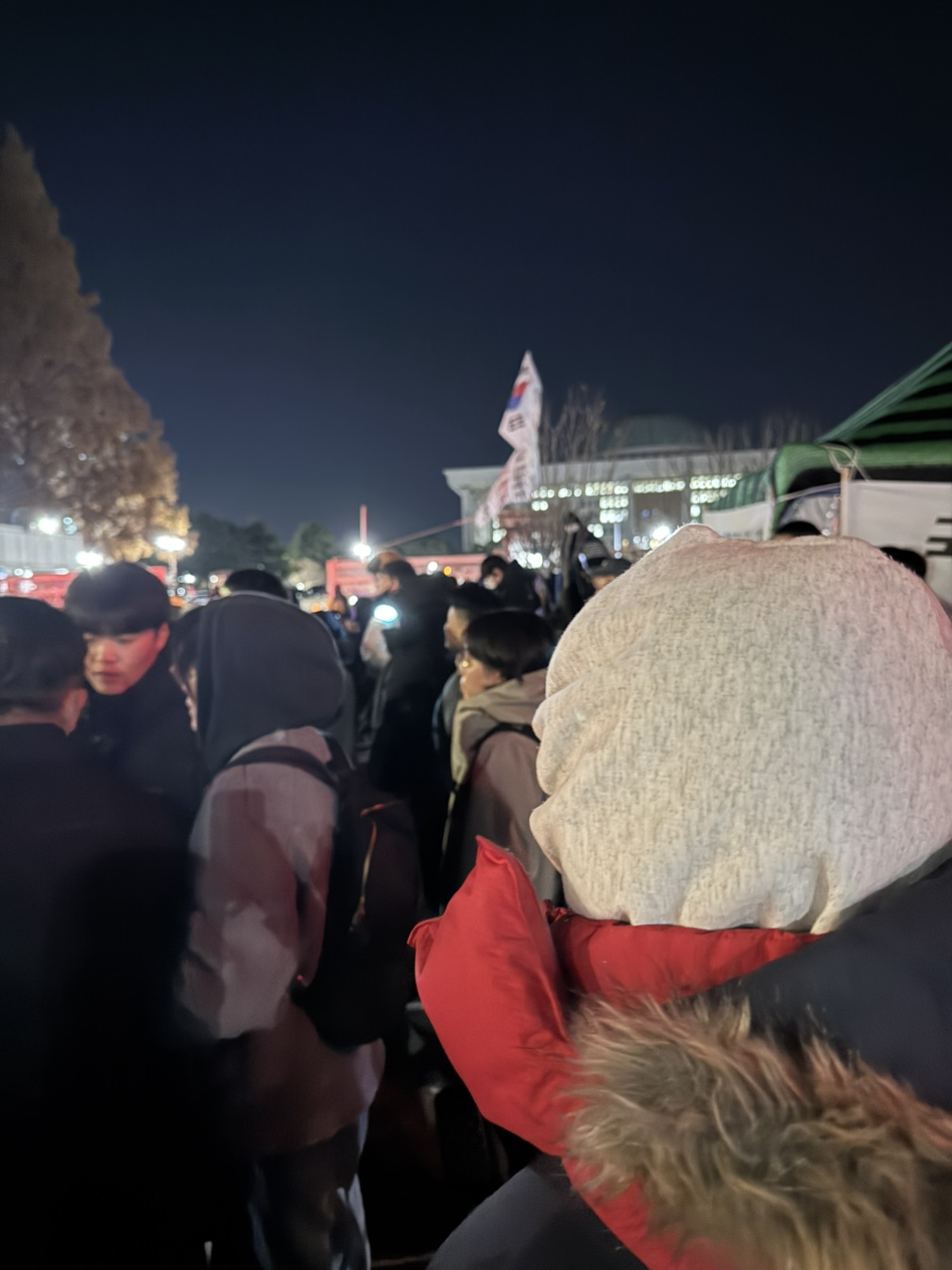 순간 어이가 없었다. 차를 멈추고 '나도 집회에 참여하러 온 거야. 인마. 너만 정의로운 척하지 마! 지나가는 사람한테 소리 지르는 건 정당한 거냐?'라고 대응해주고 싶었다. 당장이라도 그러고 싶었다. 하지만 옆에는 아내가 타고 있었고 차가 뒤따라 오고 있었다. 갑자기 정차를 할 수 있는 곳도 없었다. 결국 여의도 빌딩 사이 어딘가에 주차를 하고 대로를 건너 국회 정문으로 갔다. 기분이 내내 좋지 않았다. 나에게 소리를 지른 그 사람 때문이었다. 그도 나도 어리석게도 엉뚱한 곳에 화풀이를 하고 있었던 것이다. 국회 앞사람들의 인파 속으로 들어갔다. 추웠다. 내일은 더 추울 것 같았다. 벌써부터 걱정이 됐다. 사람들과 함께 구호를 외치다 보니 자연스럽게 사람들의 얘기를 듣게 됐다. 집회에 참가하기 위해 커뮤니티에서 모인 사람들 같았다. 이 십 대로 보이는 여성 세 명이었다.