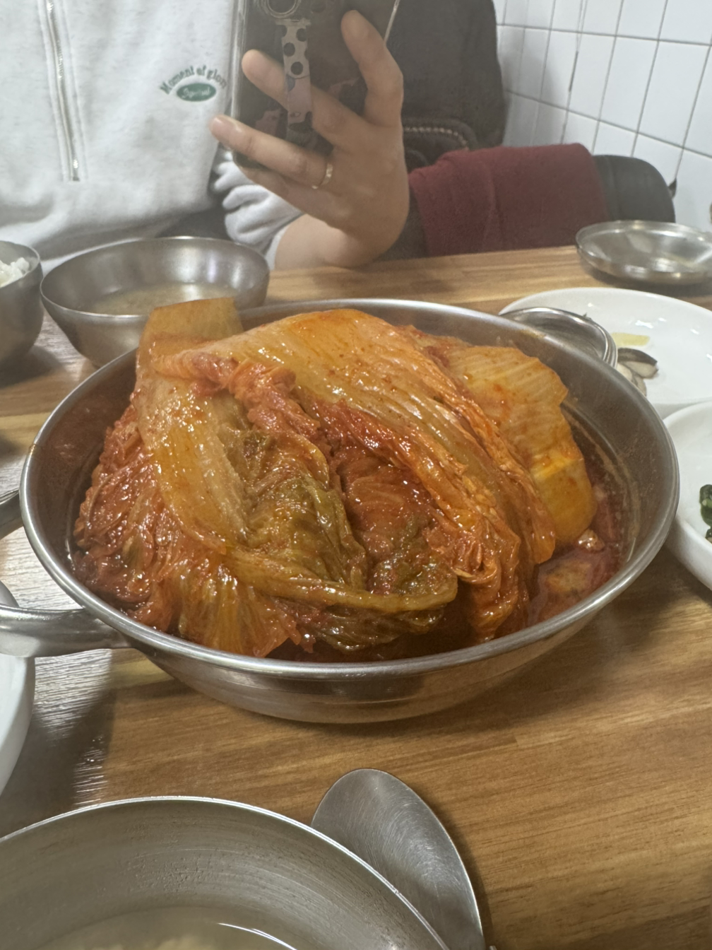 김치찜인데 김치가 짜지 않고 고등어는 밑간이 배지 않아 심심한 편인데 바로 그게 포인트다. 도톰한 고등어살을 젓가락으로 크게 발라 김치와 싸 먹으면 어디에서도 먹기 힘든 담백한 고등어 본연의 맛이다. 식당 리뷰를 보니 어떤 이는 간이 잘 안 배서 실망이라는데 이 식당은 바로 그게 맛의 비결이다. 고등어는 쉽게 비려져서 적당한 간이 필수다. 그런데 간을 하지 않고도 비린 맛을 잘 잡아낸 건 소문난 식당이 자부할 만한 점이다.