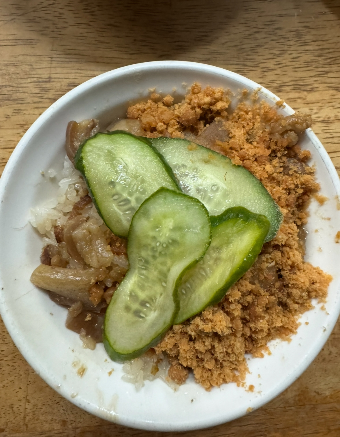맨밥에 돼지비계조림을 올리고 말린 고기 가루를 올린 '로우송 덮밥'