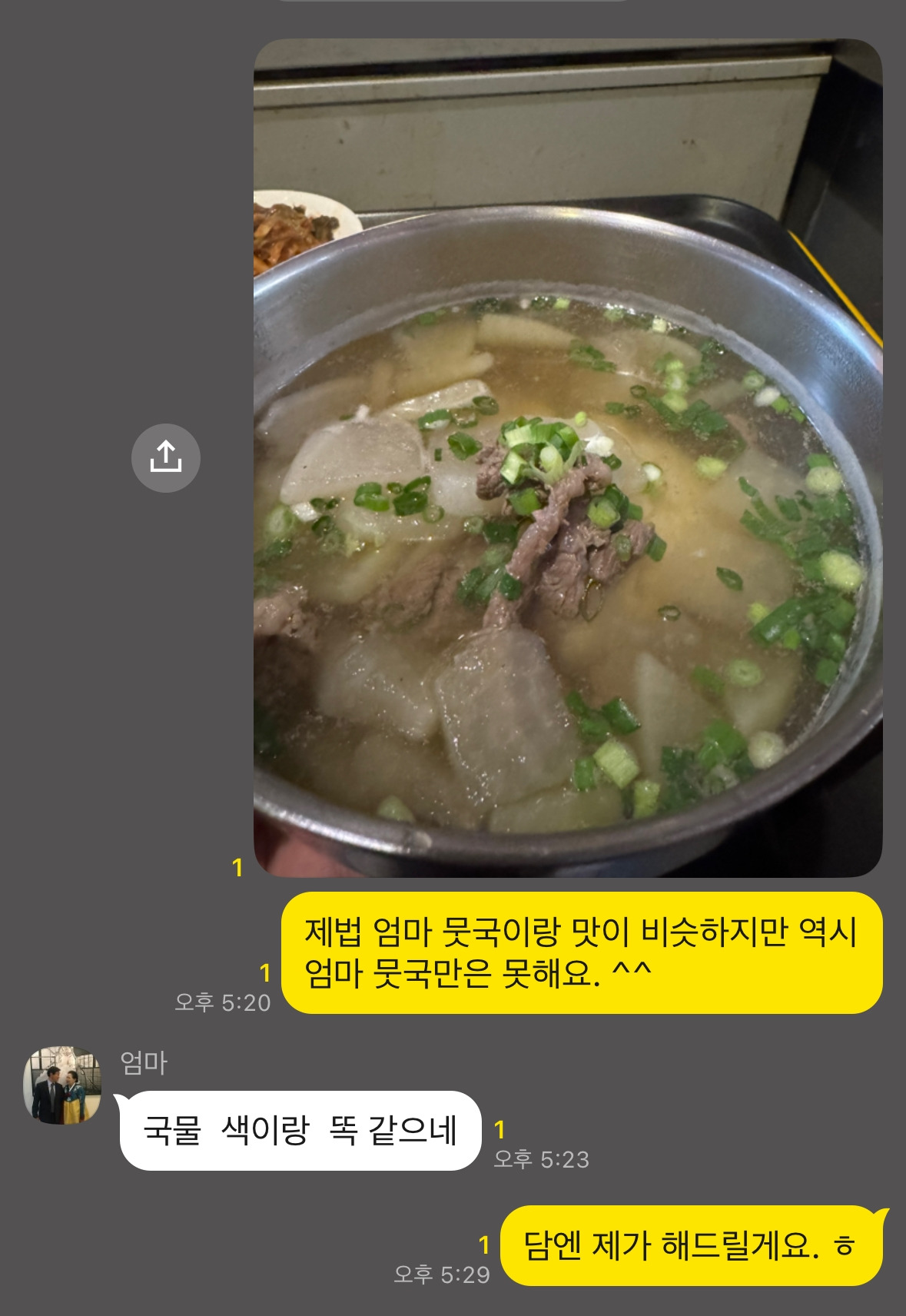 며칠 전, 뭇국이 먹고 싶어 국거리 소고기를 사고 무를 한 통 샀다. 엄마가 끓이던 걸 오랫동안 옆에서 봐왔기 때문에 순서를 잘 떠올려서 뭇국을 끓였다. 오래 먹어본 건 못 속인다. 제법 맛이 났다. 세 그릇 정도가 나왔는데 아내와 한 그릇씩 맛있게 먹고 한 그릇은 잘 포장해 두었다. 뭇국을 점심 메뉴로 팔 때 맛있게 드셨던 손님 한 분이 생각났다. 시간 되면 가져가시겠냐고 물었고 근처에 계시던 손님은 그러겠다고 답하셨다. 그로서 이번에 끓인 뭇국은 더 완벽해졌다.