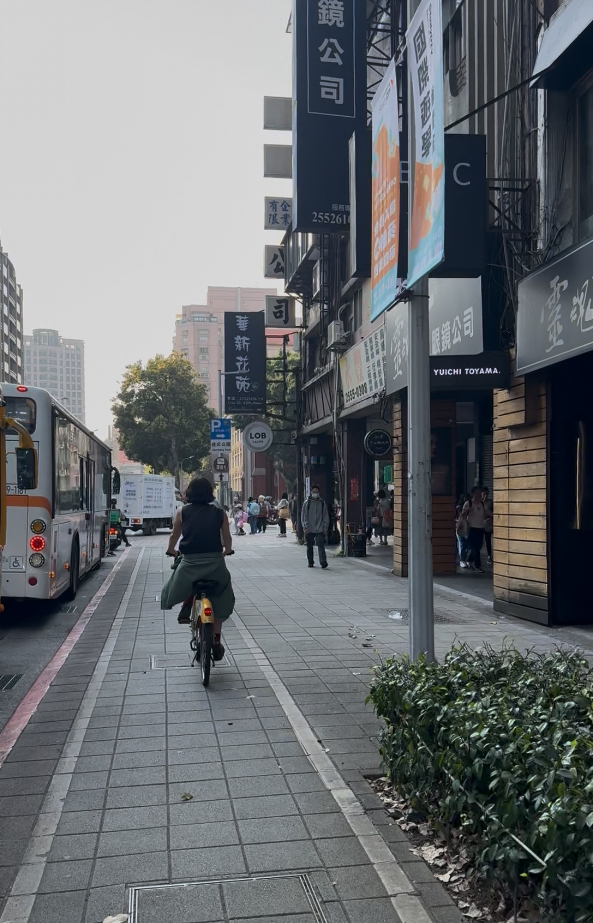 토비와 아내가 나란히 자전거를 타기 시작했고 나는 그 둘의 뒤를 천천히 따라갔다. 인도 한 켠이 자전거 도로였다. 중간 중간 끊기는 서울의 자전거 도로와 달리 타이페이의 자전거도로는 하나의 길로 길게 이어졌다. 자전거 도로만 계속 따라가면 되니 불안감이 덜했다. 평소 자전거를 탈 때, 안전에 대해 민감하게 생각하는 아내도 빠르게 적응했다.