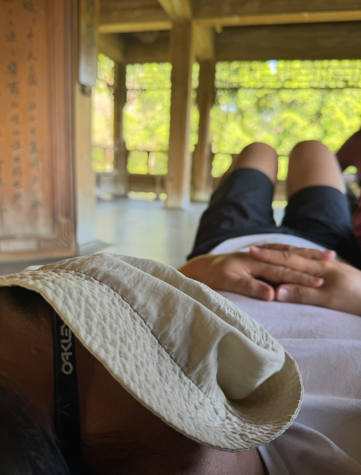 계단을 내려오니 좌측에 정원이 있었다. 해가 뜨거워 그늘 진 정원을 통해 밖으로 나가기로 했다. 정원에 들어서자마자 시원함이 느껴졌다. 대만은 습도가 높은 나라라고 하던데 3월이라 그런지 햇볕만 피하면 선선했다. 멀리 정자가 보였다. 자연스럽게 걸음이 옮겨졌다. 신발을 벗고 들어갈 수 있는 정자라면 좋으련만 신발을 신고 올라가는 곳이었다. 대신 벤치가 넉넉하게 있어 사람들이 여유롭게 쉴 수 있다. 조금만 앉았다 가기로 했다가 도저히 못 참겠어서 아내의 무릎에 누웠다. 쓰고 있던 벙거지 모자를 벗기며 아내가 말했다.