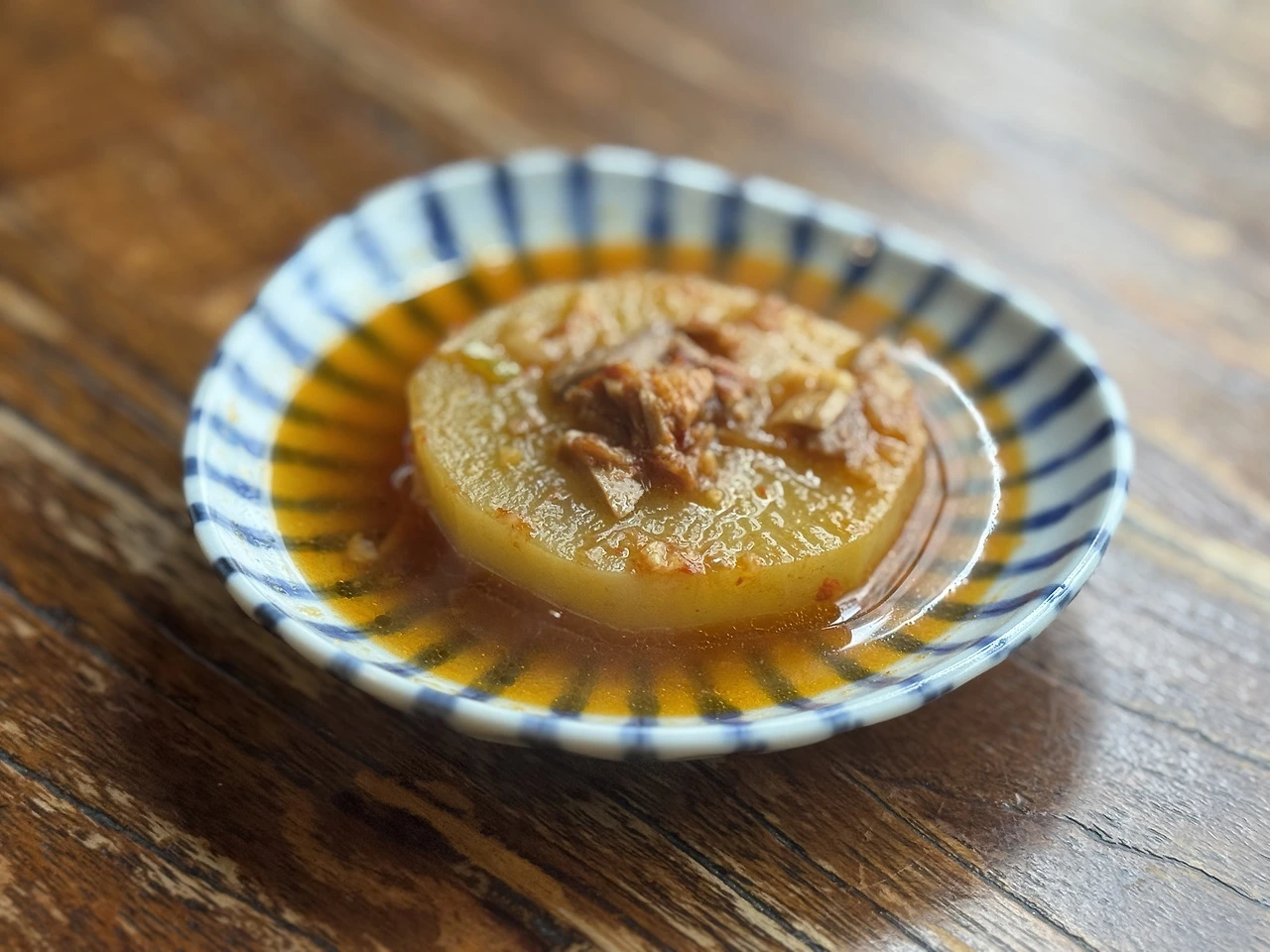 약불에 뭉근하게 조려 단단한 무에 서서히 맛이 스며드는 것!