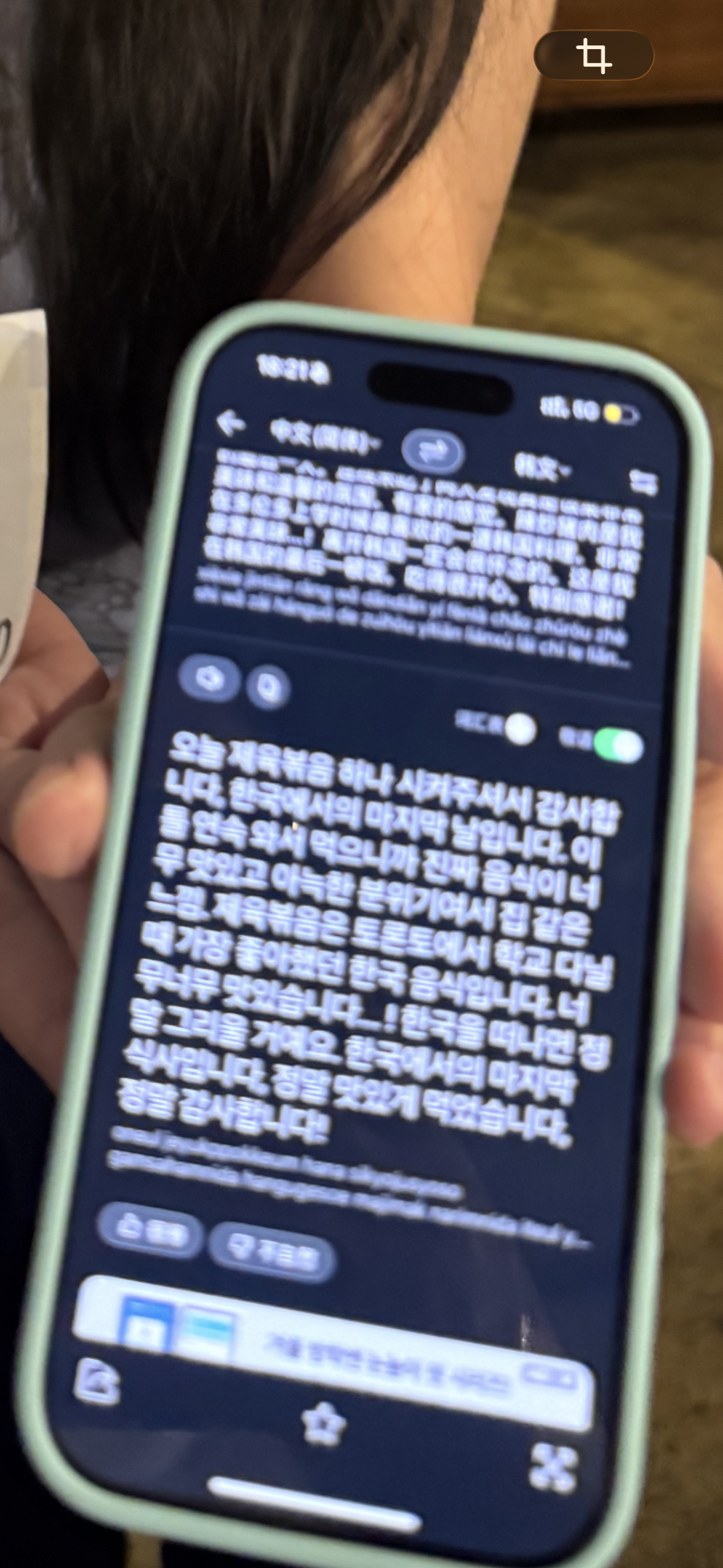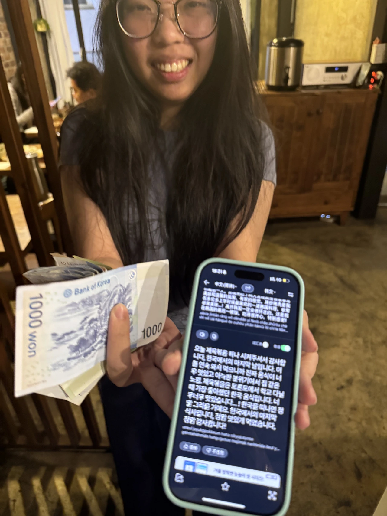 천천히 음식을 즐기고 계산을 하러 온 친구가 갑자기 휴대폰을 눈앞으로 내밀었다. 휴대폰 화면에는 한국어로 번역된 문장이 뺴곡하게 차 있었다.