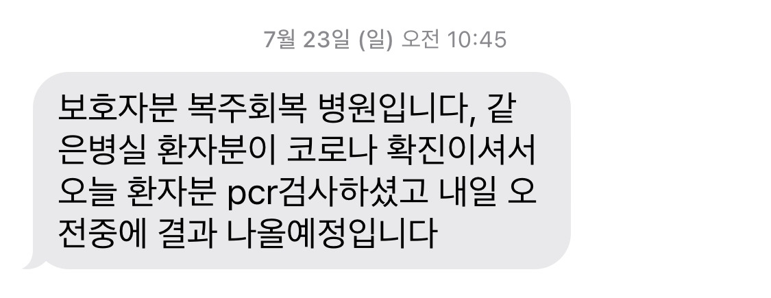 갑자기 무슨 소리? 병원에 전화해 보니 메시지 그대로였다. 아버지 병실에 함께 있는 환자가 코로나 확진 판정을 받아 아버지도 코로나 검사를 받았는데 만약에 아버지도 확진을 받는다면 검사를 받을 수가 없는 상황이었다. 검사는 둘째치고 아버지가 코로나에 확진이 된다면 현재 상황에서는 건강이 치명적으로 악화될 수도 있다.