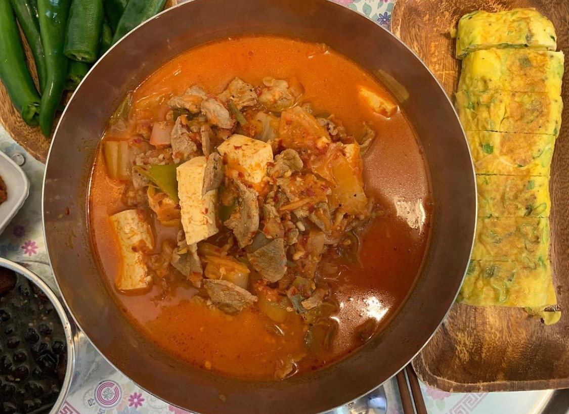 거래처 정육점 사장님에게 특별히 부탁한 찌개용 돼지고기를 넉넉하게 사고 육수용 멸치도 산다. 육수용 멸치를 약불에 살살 저어가며 덖어낸 후 물을 부어 육수를 만든다. 그래야 비린맛이 덜하고 구수한 육수맛이 살아난다. 육수가 준비 됐으니 가장 커다란 웍을 꺼내 뜨겁게 달군 후 돼지고기를 듬뿍 넣어 돌려가며 굽는다. 돼지기름이 웍 바닥에 모아지며 지글지글 끓어오를 때, 미리 만들어두었던 멸치육수와 김치를 함께 넣고 불을 높인다. 찌개가 폭발할 것처럼 폭폭 소리를 내내 끓어오를 때 불을 중불로 줄이고 양파와 대파를 넣고 한번 더 끓여내기만 하면 김치찌개 완성.