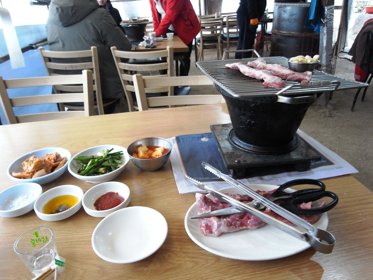 식당 주인은 아마도 나를 혼자 고기를 먹으며 촬영을 하러 온 유튜버로 생각한 모양이었다. 여긴 그런 사람들이 꽤 있었을 것 같기도 하다. 메뉴를 보니 통갈매기와 양념갈매기가 있다. 어서 주문하라는 주인의 눈빛에 통갈매기 2인분과 소주 한 병을 시켰다. 1인분은 당연히 안될 것이고 먹다가 남기면 될 일이었다. 밖에서 고기를 혼자 구워 먹는 건 처음이었다. 다행히 손님은 한 테이블만 있었는데 중년의 남자 한 명과 여자 두 명이었다. 나보다 조금 일찍 둘레길을 먼저 걸은 것 같았다. 나를 힐끔힐끔 보는 게 느껴졌다. 애매한 정적이 흘렀다. 그들의 대화에도 나를 의식하는 것이 느껴졌다.