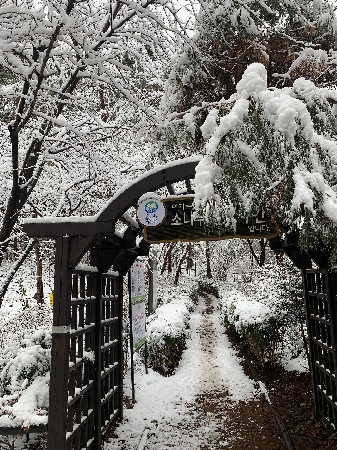 북한산 둘레길 1코스 안내판이 있는 관문으로 들어서니 눈밭이 시작됐다. 키가 큰 소나무에 눈이 수북하게 쌓여있었다. 아무도 없길래 조금 크게 감탄을 했다.