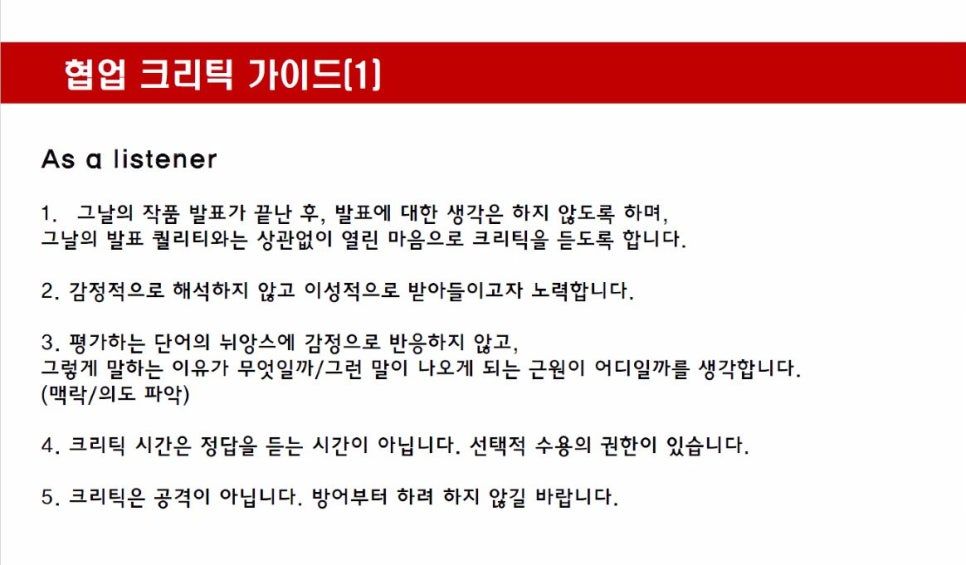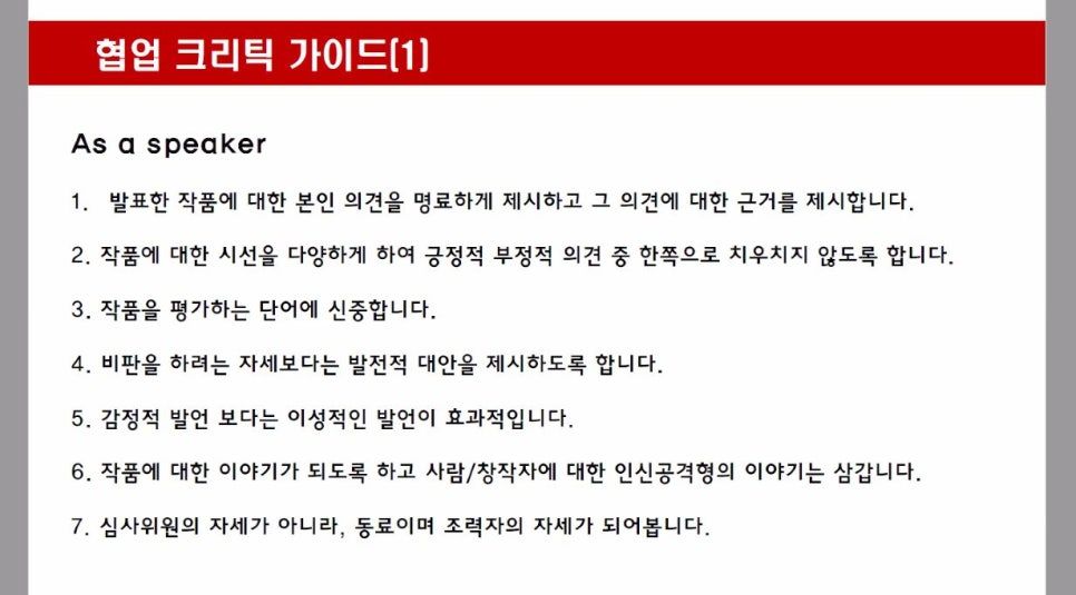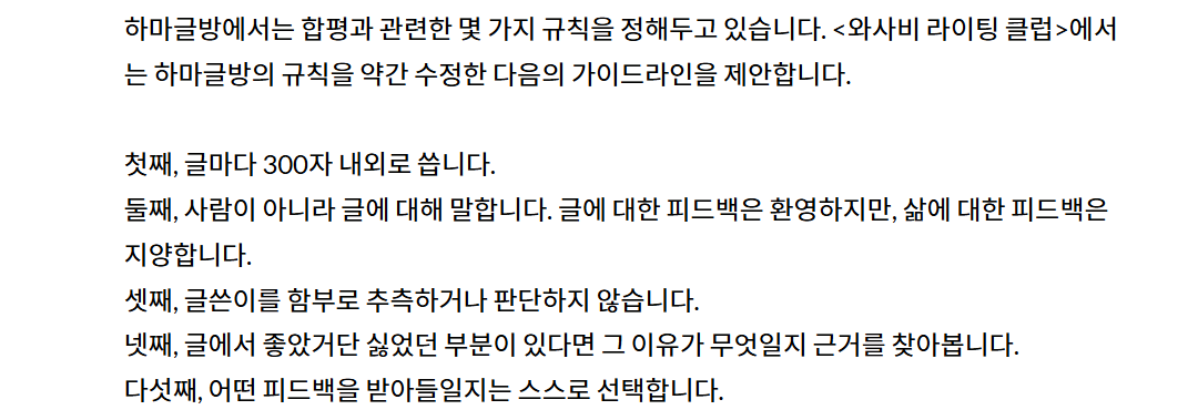 종종 위 이미지와 같은 상냥한 규칙을 보게 되는데, 이런 문구를 읽으면 외려 나는 글쓴이의 방어기제가 독특하다는 생각을 한다. 합평에 임하는 사람들의 태도는 크게 둘로 갈린다. 전투로 받아들이거나, 반대로 상냥함을 잃지 않으려 하거나. 하지만 상처받고, 분노하고, 뒷말하고, 마음속에 쌓아두다가 병나고, 그러다 싸우거나 안 보는 게 평범한 다수의 반응이다. 섬세한 규칙은 갈등을 유예할 순 있어도, 진화하진 못한다. (우선적으로, 구성원 간 신뢰가 충분히 형성된 모임에서만 실현 가능할 것이다.) 합평 스터디는 근본적으로 ‘텃세 부리기’이기 때문이다.