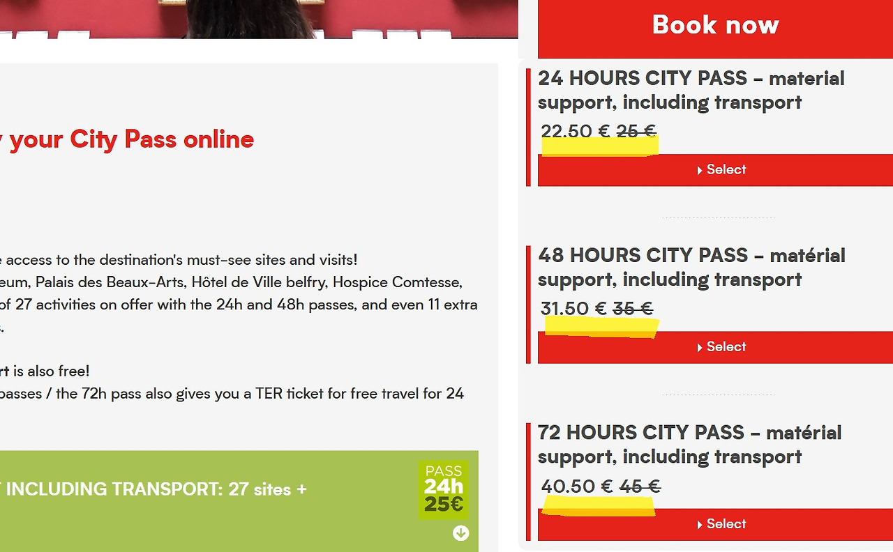 사이트로 들어가시면 10% 할인이 적용되어 인터넷 구매 가격이 현장 구매보다 2유로에서 4유로까지 낮아지는 것을 확인할 수 있다. 만일 이미 릴에 도착하신 상태에서 할인 혜택을 원하신다면, 먼저 인터넷 구매를 진행하신 후 릴 관광 안내소에 들러서 코드와 디지털 바우처를 제시하셔서 실물 카드를 발급 받으시면 된다.