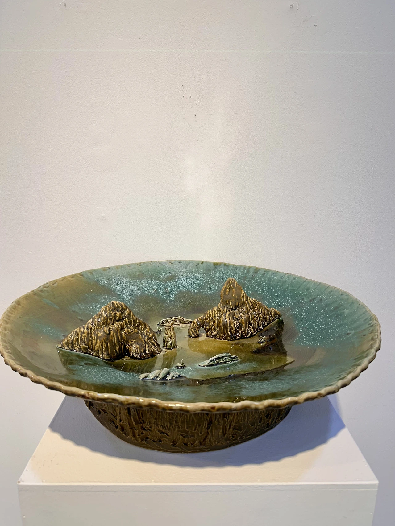 그가 표현하는 독도는 전체적으로 바다와 섬, 그리고 그 위에 떠다니는 듯한 새들이 평화로운 조화를 이루는, 어머니와 같은 대자연의 미니어처이다. 바다 부분은 푸른 색조의 레진을 사용하여 파도와 물결의 질감을 잘 표현하고 있으며 중앙에는 바위섬처럼 보이는 구조물이 있고 그 표면에 마치 진짜 바위와 같은 패턴이 살아 있는 토양의 모습을 재현하는 듯하다. 주변에는 여러 마리의 새가 물 위에 마치 떠 있듯 배치되어 마치 무리를 지어 바위섬을 둘러싸고 있어 독도의 생태적 조화와 평화로운 분위기를 연출하고 있다. 바위의 배치가 절묘해서 균형감과 리듬감을 부여하는 그의 독도 작품은 바위의 거칠고 웅장한 결을 세밀하게 살려 자연의 강인함을 전달한다. 또한 동해의 맑고 깊은 심연을 표현함으로써 시간과 공간을 응축시켜 놓은 투명한 푸른 층들을 만들어낸다. 청동, 철, 알루미늄, 목재, 플라스틱, 유리, 왁스 등 자신이 사용하는 다양한 재료들의 가능성을 실험하며 지형이나 풍토가 갖는 자연의 역사와의 관계를 탐구하는 영국의 대지미술 조각가 토니 크랙(Tony Cragg)의 조각처럼 그가 흙 작업을 통해 구현해 내는 기암괴석과 푸른 바다 등의 세밀한 자연 풍경은 도예의 도전에 관한 실험이 아닐 수 없다. 재료나 장르가 다르지만 섬, 산, 솟대 등 자연적이고 향토적인 메시지를 담는 형상을 구현하는 그의 작품 역시 토니 크랙의 작품처럼 조형성과 특유의 물성이 강조된 작업이다. 조합토와 불을 주된 매체로 하며 유약 처리, 환원 소성 등을 통해 형태와 색을 그만의 방식으로 조율, 변주하는 등 그의 작품은 전통적 도예 기법과 현대적 조형 기법을 병행하여 만들어낸 보기 드문 수작이라 할 수 있다.