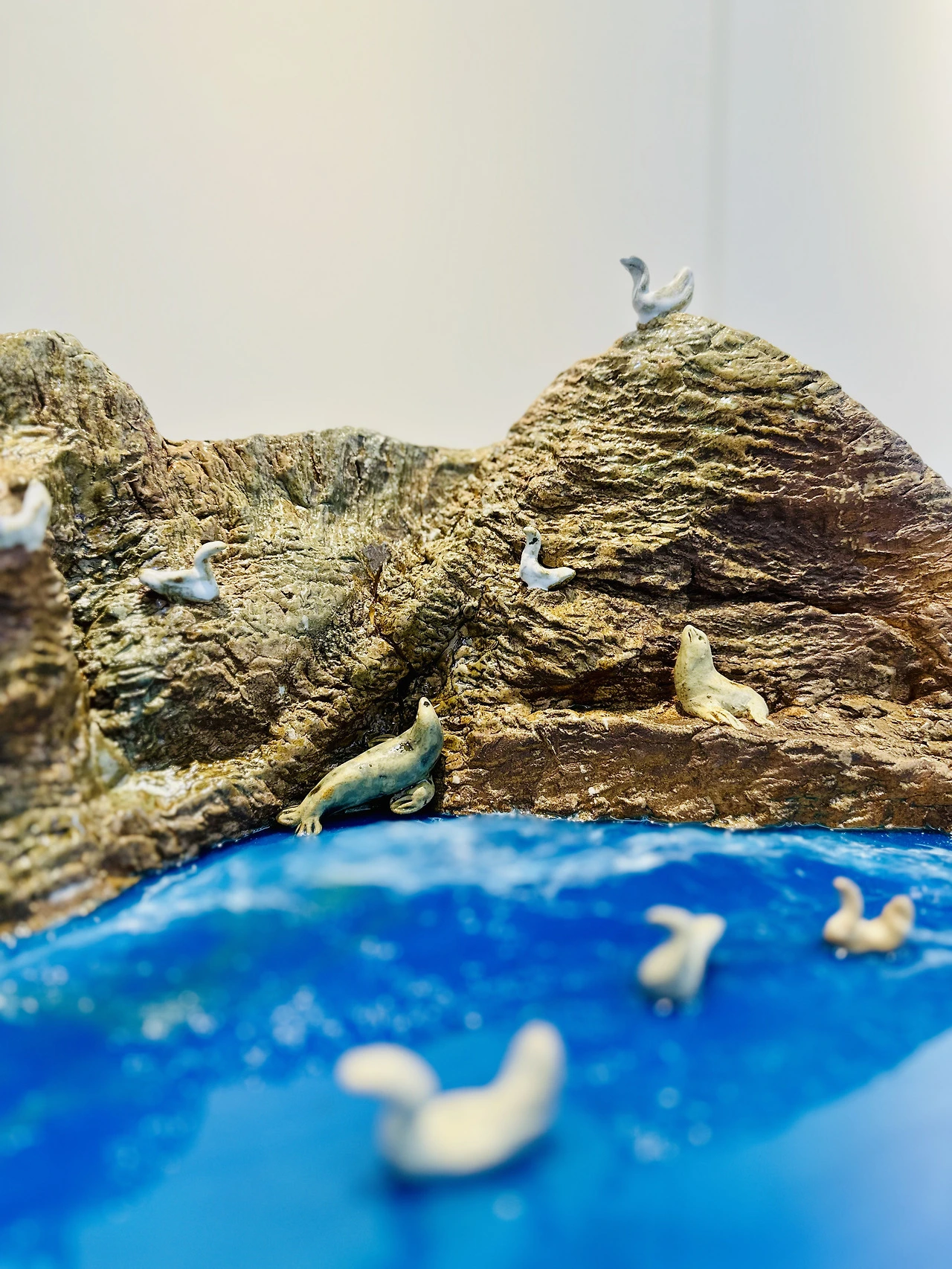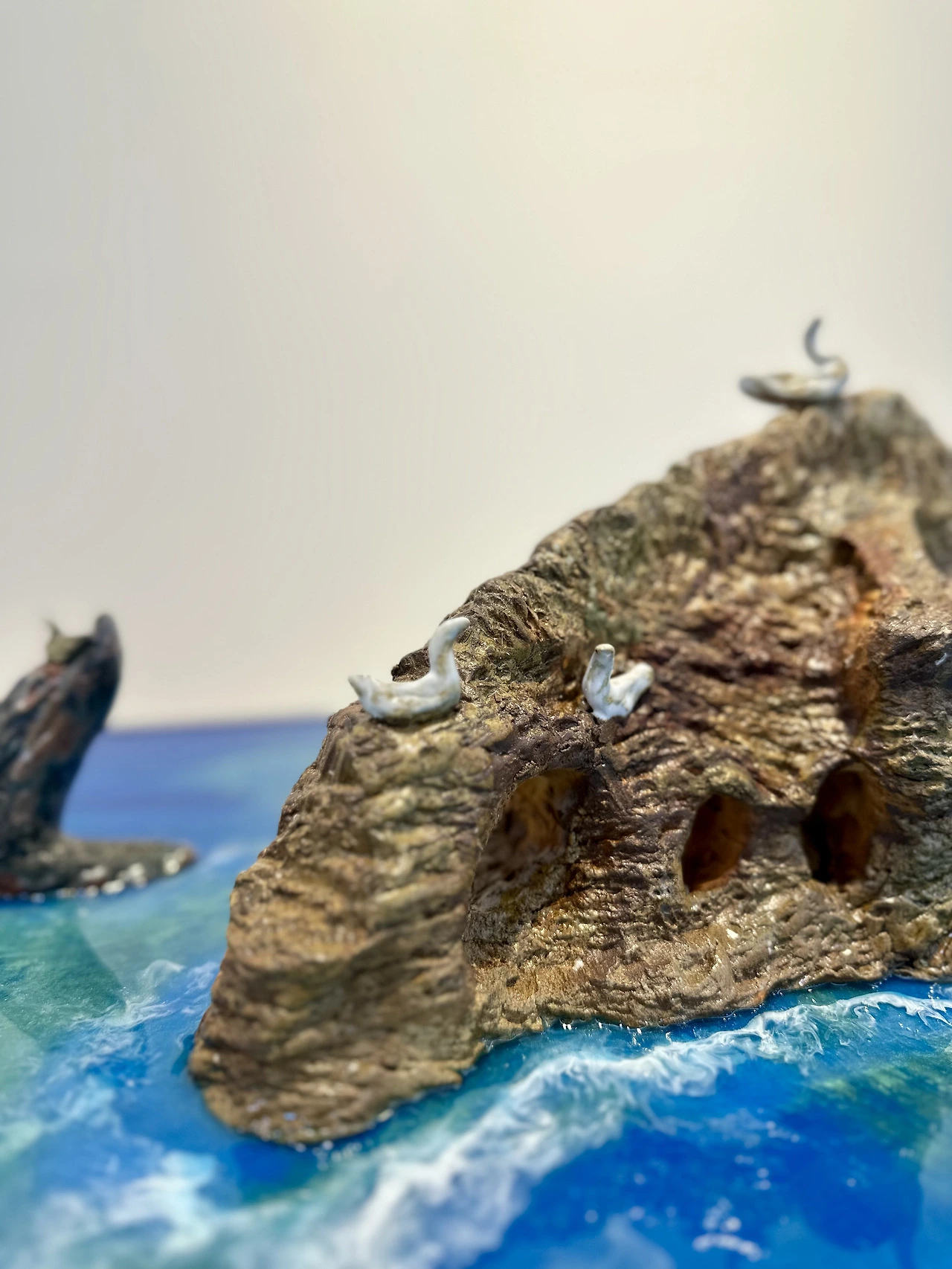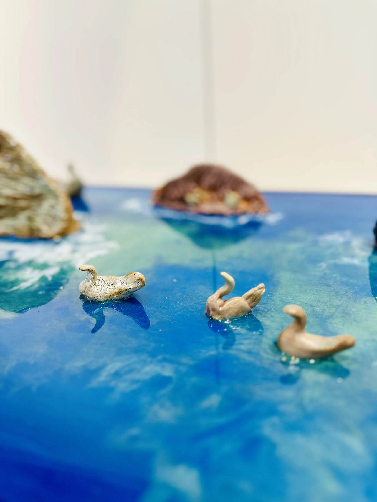 누구든 마음속에 닿을 수 없지만 돌아가고픈, 소설가 김승옥의 소설, ‘무진기행’의 무진처럼 숨겨두고픈 이상적인 공간 하나를 품고 살아간다. 현실에 없기에 더욱 동경과 그리움의 대상이 되는 공간, 문차식 작가에게 ‘독도’는 그러한 마음의 고향 같은 장소였을 것이다. 깊은 바다를 형상화한 듯한 푸른 투명 레진 위에 크고 작은 섬들과 여러 마리의 새가 떠 있는 모습, 깎아지른 바닷가의 절벽을 표현하기 위해 거친 나무껍질 같은 질감을 하나하나 표현한 점 등으로 미루어 보아 그에게 독도는 각박한 현실에서 탈피하게 해 주는 공간, 마치 마음 한편에 마지막 남은 한 개의 잎사귀처럼 소중한 곳, 그것을 지키고자 하는 간절한 심정이 들게 되는 상징적인 공간이었을 것이다.