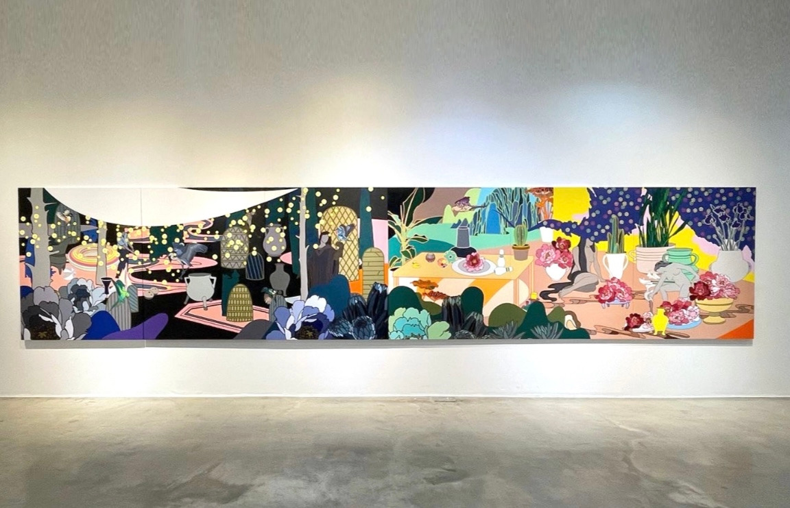 작가의 최근작들은 거대한 풍경에서 보다 친근한 정물로의 이행, 그 속에서 계속되는 동서양의 형식이나 내용의 융합에 관한 작품들이다. 고대의 석고상 혹은 사람의 얼굴 형상을 한 꽃병에 놓인 꽃들은 작가가 구사하는 특유의 파스텔 색감으로 인해 환상적인 실내 혹은 어떤 비현실적인 공간을 암시하고 프란시스 베이컨(Francis Bacon)을 비롯한 많은 화가들이 즐겨 사용한 전통 종교화의 일종인 삼면화(Triptych)의 형식으로 전시되었다. 초록 수련이 펼쳐진 연못을 보며 따라 걷는 빗 속의 산책을 묘사한 작품, ‘우중산책(雨中散策)’ 또한 캔버스가 배접된 네 폭 병풍이다. 석고상과 같은 서양의 모티브를 사용하기도 하고 용왕을 살리기 위해 구해야 하는 토끼의 간을 대신해 버섯이 등장하는 등 동양적 내러티브를 암시하기도 하며, 동양화에서 중시되는 윤곽선을 먹의 검은색 대신 자신에게 의미 있는 다른 파스텔 계열의 색으로 처리하는 등 동서양 회화의 여러 특징을 혼용하여 더욱 다채롭고 신비스럽게 표현하고 있는 것이다. 그것이 행복과 부귀영화에 관한 것이든, 죽음에 대한 경고이든, 더 나은 삶에 대한 교훈이든, 즐거움을 추구하고 복을 구하는 염원이든 동서양의 정물화의 많은 요소를 자유롭게 변주시키며 작가는 평면 위에 자신만의 유토피아를 튼튼하게 구축하고 있다.
