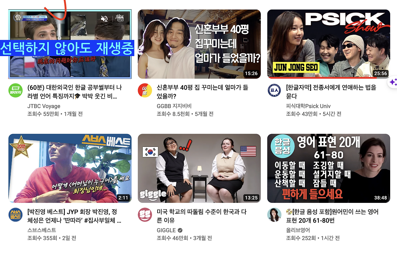 (TV는 채널 돌릴 때마다 콘텐츠가 재생되고 있고, 유튜브도 본인의 의지와 상관없이 타임라인에 있는 콘텐츠가 preview로 자동 재생되고 있다.)
