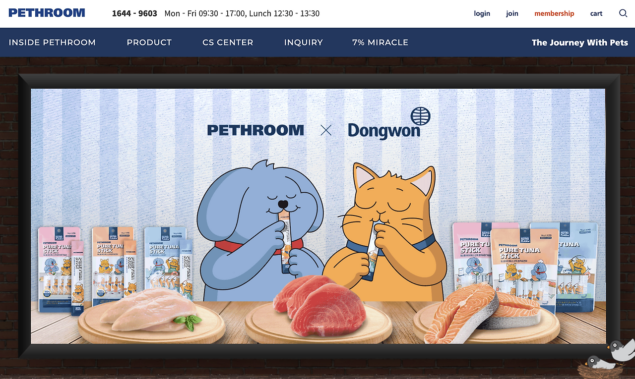한국인들이 잘 쓰지 않을 것 같은 컬러 노란색, 파란색으로 이루어진 화려한 색상 조화, 각 캐릭터 그림, 디자인 등과 영어로만 되어있는 UX/UI가 해외 브랜드 느낌을 물씬 나게 하고 특히 아래 사업자명 관련 정보를 보면 영어로 되어 있어 많은 사람들이 해외 브랜드로 생각할 수 있다. 하지만 페스룸 역시 토종 브랜드이다. 강남구에 위치하고 있는 비엠 스마일은 제품 패키지, 디자인 모든 면에서 외국 느낌 나도록 힘썼다. 어떤 제품은 캐릭터끼리 대화하는 장면을 제품 패키지에 넣었는데 그 마저도 영어로 되어 있다. 반려동물 용품이라면 해외 제품을 선호하는 국내 소비자들의 취향을 잘 파악했고 이를 적절하게 잘 활용한 것 같다. 특히 캐릭터 위주의 브랜딩은 내러티브 마케팅(캐릭터나 브랜드 시그니처 콘셉트를 통해 세계관 형성하여 팬덤을 만드는 것)의 일부로 잘 구현한 것 같다. 하지만 너무 외국어로만 되어 있으면, 거부감이 들기 때문에 중요한 제품 구매 금액, 상세 정보처럼 구매 전환에 결정적인 부분은 소비자들을 위해서 한국어로 풀어놓는 것이 좋다.