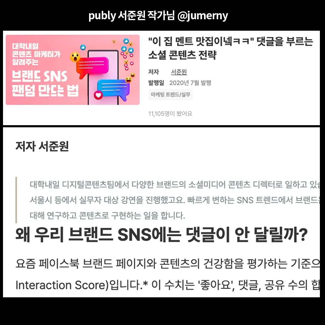 #아카이브 1. 카피라이팅 공부. publy의 서준원 작가님 @jumerny 내가 좋아하는 딱! 실무예시를 많이 보여주는 작가님이시다. 국문학과 나오셨는지 카피라이팅에 대해 상당히 논리적으로 설명해주신다. 실무를 바탕으로 설명해주셔서 나는 이해되는 데 너무 좋았다. 이분이 publy에 작성하신 글은 꼭 정독해야한다.