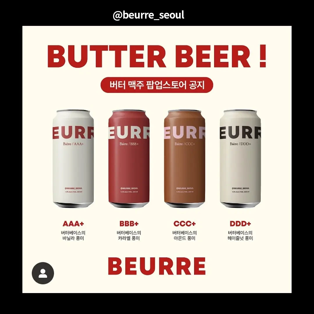 . 4. 주류브랜드. @beurre_seoul 내 사랑 버터 맥주 브랜드이다. 프랑스 의류 브랜드에서 낸 첫 F&B 음료 브랜드이다. 버터 풍미가 가득한 맥주. 마케팅인지 모르겠지만, 호그와트가 연상되는 것 같다. 여기 브랜드는 처음에 콘텐츠 컬러와 폰트 디자인이 좋아서 출시되었을 즈음부터 팔로우해서 지켜보고 있던 브랜드이다. 첫 출시부터 지금까지 팝업 스토어 오픈은 압구정 갤러리아 백화점 식품관부터 시작했다. 만약 편의점부터 입점해서 출시했다면 이렇게 핫해졌을까? 버터 풍미에 대한 콘텐츠, 맥주의 맛이 상상되는 콘텐츠, 팝업 스토어에서 ‘판매 갯수 제한, 조기 품절 예상, 오픈런 이벤트’ 게시글을 보면서 대세감과 희소성까지 입혀져 더 핫해진 것 같다. 계정에 콘텐츠들도 일관성있고, 디자인도 깔끔하고 컬러픽이 브랜드와 FIT해서 브랜딩 콘텐츠 디자인으로 참고하면 좋을 것 같다. 그리고 정말 눈에 띄일만큼 맛있다.(NO광고, NO협찬. ONLY내돈내산)