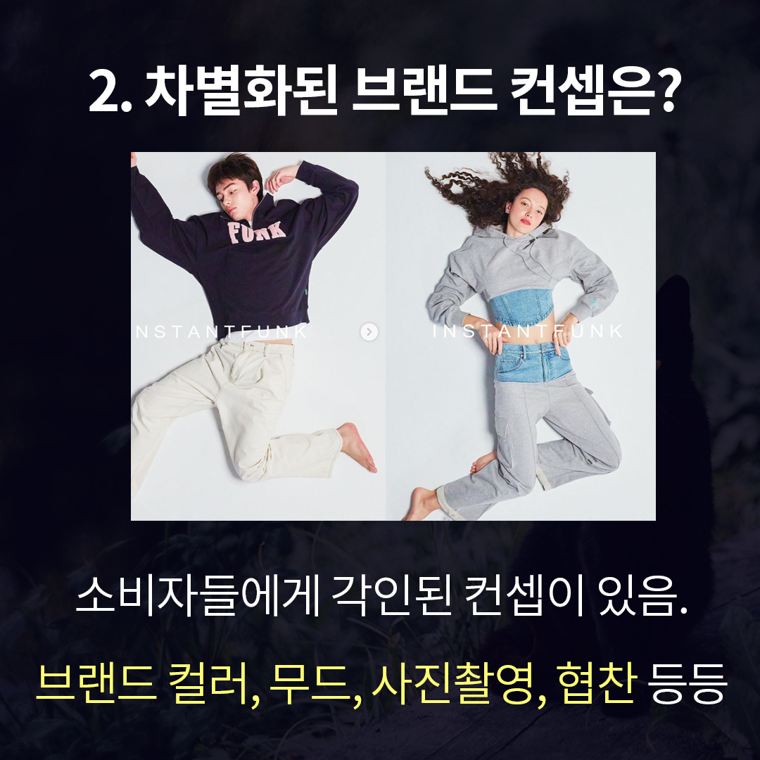 패션으로 치면 화보 사진 자체를 독특한 시그니처 느낌으로 일관되게 찍는 것이다. 누워서 찍거나 콘트라스트를 엄청 강조하거나 다른 브랜드 예시로 우산을 늘 들고 있거나. 시그니처로 삼을만하고 임팩트 있는 무언가를 항상 일관되게 보여주는 것이다.