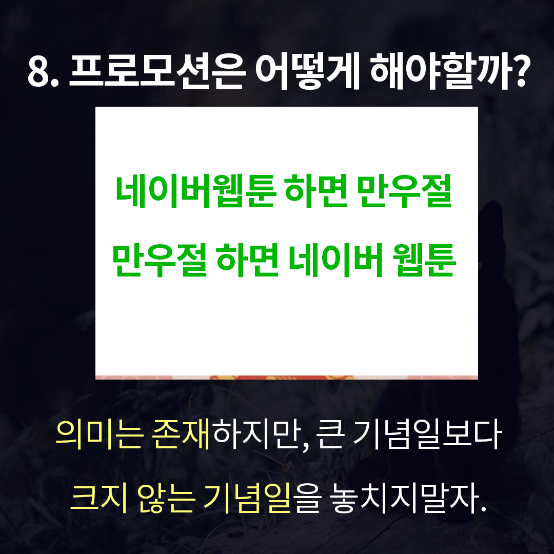 위 내용들을 한꺼번에 다 반영하여 전략을 세우기는 어렵다. 하나씩 차근차근하면서 검토를 하는 형식으로 전략을 짜야한다. 브랜딩 메시지를 설정했다면 이걸 어떻게? 브랜딩 메시지를 전달하고 있다면 이거를 커뮤니티로 어떻게?? 프로모션을 진행하고 난 후 사람들에게 어떻게 임팩트 줄까 등등등