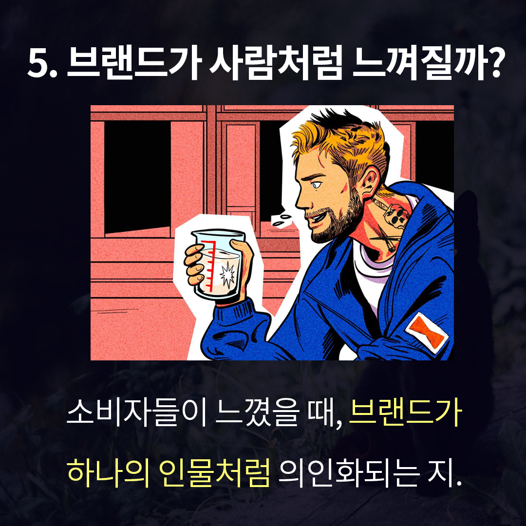 소비자들이 브랜드를 하나의 인격체로 느끼게끔 브랜딩하고 있는지이다. 모든 브랜드가 의인화를 성공적으로 진행할 수 없겠지만, 스웨덴 피크닉이나 마크 홀리, 노티드 도넛, 빙그레 등 캐릭터를 이용해서 세계관을 만들어 브랜딩 하는 브랜드는 확실히 팬덤 형성이 견고하고 남다르다.