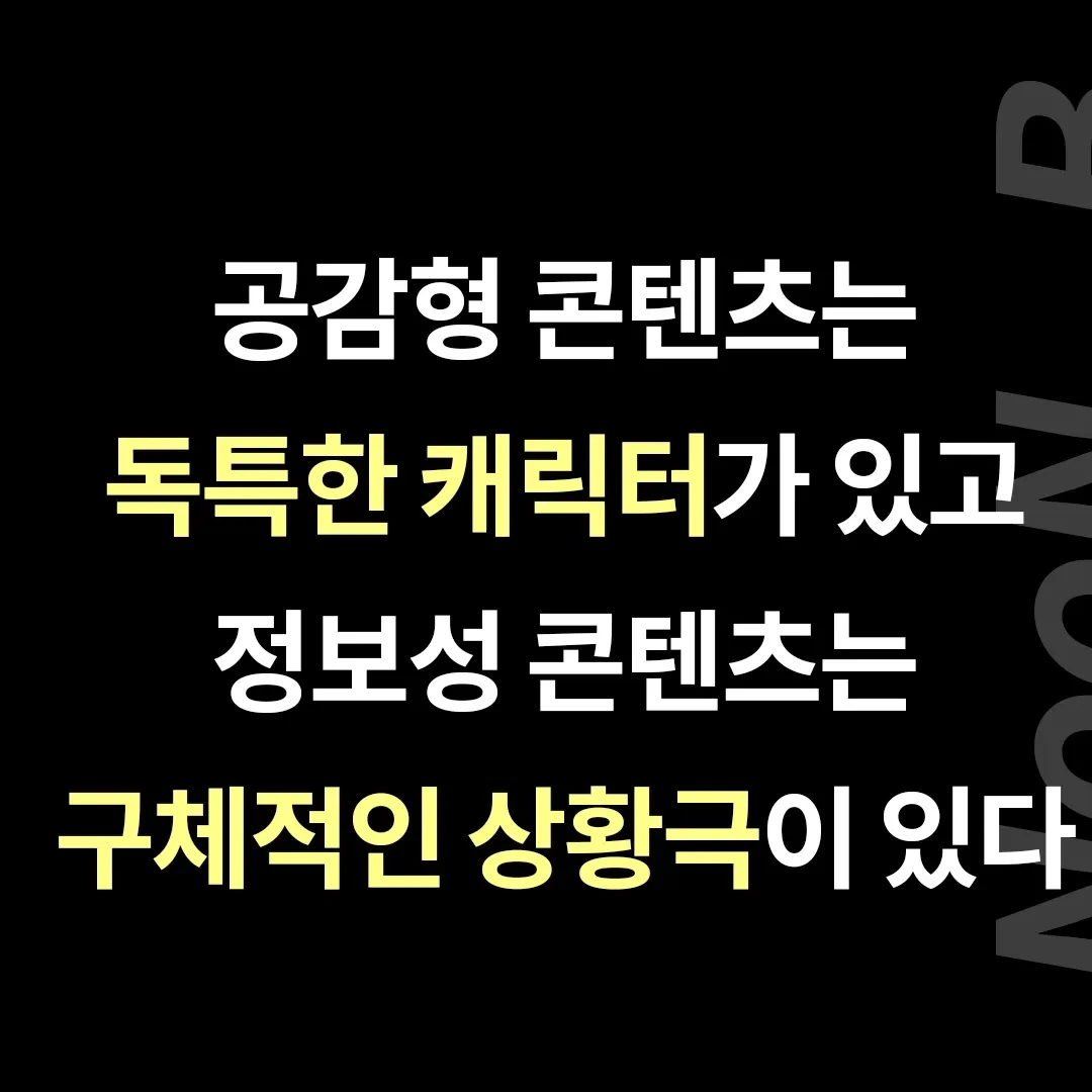 뚜렷한 인물이어야 한다. 캐릭터 설정을 디테일하게, 그리고 누가 봐도 상상이 가게끔 해야한다. 즉, 어디서 본적이 있는 인물을 디테일하게 그려야 한다는 것이다. EX>> -IT 스타트업에 근무한 지 3년된 개발자 -여초 회사에 근무한 지 2년 된 24살(나보다 나이 어린) Z세대 선배 -소개팅 할때, 영화 예매가 정석이라고 생각하는 너드남 . 그럼 이걸 활용해서 어떤 공감형 콘텐츠를 제작할 수 있을까? EX>> -IT개발자 3년차 현실 vs 개발자를 꿈꾸는 경영학도 -여초 회사에 나보다 어린 젊꼰이 있다?젊꼰에 말리지 않는 방법. -소개팅 할때, 뭐 할 지 몰라서 영화보는 사람 손? 소개팅 데이트 시 하면 좋은 3가지 . 일반적인 정보성 콘텐츠는 아래와 같다. EX>> -맛집 대기시간 때 하면 좋을 4가지. -대화에 끼지 못할 때, 자연스럽게 묻어갈 방법. -상사와 친해지는 방법 10가지 . 그럼 정보성 콘텐츠는 어떤 스토리를 넣어야 할까?