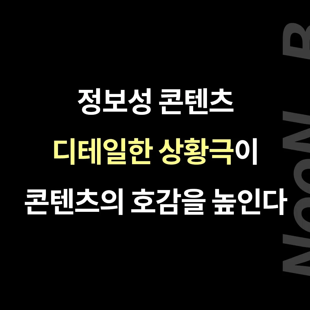 이 정보가 필요하게된 계기와 상황을 넣어주는 것이 좋다. 이 상황도 누구나 겪어볼법한 상황이고 디테일하게 그려야 한다. 그럼 어떤 상황극 혹은 스토리가 있을까? EX>> -맛집에 왔는데, 딱봐도 2시간 짜리 대기 번호인 커플, 슬슬 올라오는 여친의 짜증에 남친들은 점점 초조해지는데.. -TV, 유튜브 안봐서 사람들 대화에 끼지 못하는 사람들, 하지만 회사 생활하다보면 어느정도 리액션을 해줘야 하는데.. -일할 때, 까칠해서 무서운 상사가 밥 먹자고 한다. 이번 기회에 상사도 나를 신경써서 만든 자리인 것 같고, 나도 잘해보고 싶은데, 어떻게 해야할까? . 그럼 정보성 콘텐츠를 어떻게 엮을 수 있을까? -줄 서는 식당을 맞이하는 남친, 현명한 대처법 4가지 -문찐들이 속세에서 버티는 상황별 리액션 -무서운 상사와 밥 먹을 기회가 생겼을 때, 호감 사는 대화법 10계명 . 이렇게 나올 수 있다. 사실 위 단계를 통해서 나온 콘텐츠 결과물을 봐도 알 수 있듯이, 뚜렷한 캐릭터가 이끌어가는 공감형 콘텐츠나 구체적인 상황이 묘사된 정보성 콘텐츠나 결과물이 비슷하다. . 하지만, 내 정보성 콘텐츠가, 공감형 콘텐츠가 반응이 별로 없다면, 캐릭터가 뚜렷한 지, 상황이 구체적인지를 한번씩은 검토할 필요가 있다. 즉, 사람들이 한 번씩 겪어봤을 상황이 구체적으로 묘사되었는 지 검토해보면 이전보다 더 재밌고 구미가 당기는 콘텐츠를 제작하는데, 도움이 될 것 같다.