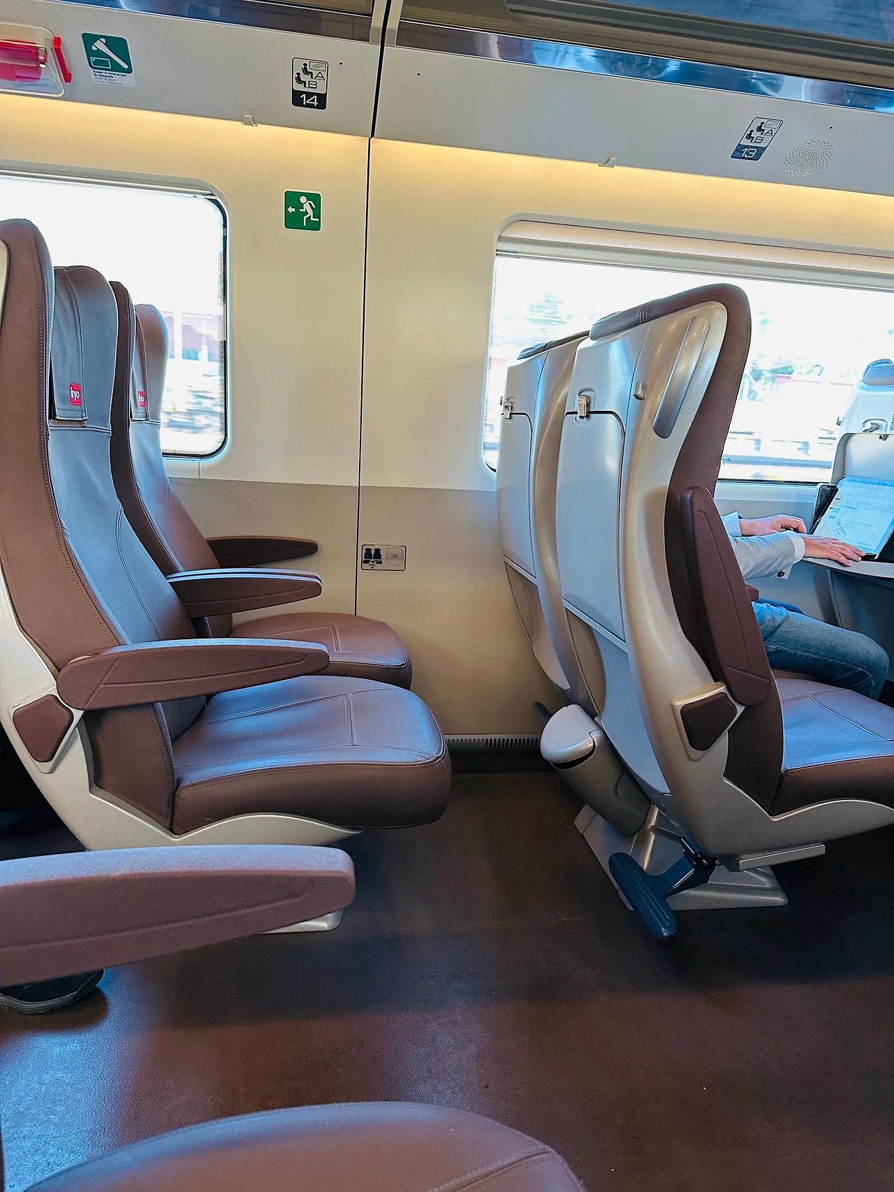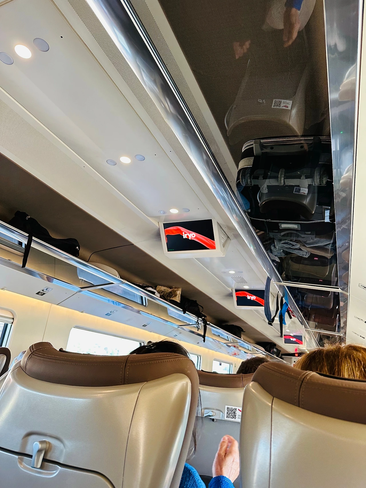 기차 내부도 굉장히 깨끗하고 쾌적했다. 내 자리는 2등석이었고, 캐리어를 좌석에 놓고 타기엔 공간은 좁았다. 짐칸이 잘 되어 있어서 짐칸에 캐리어를 놓고 자리에 착석했다. 각 자리마다 충전할 수 있는 콘센트도 있었다.
