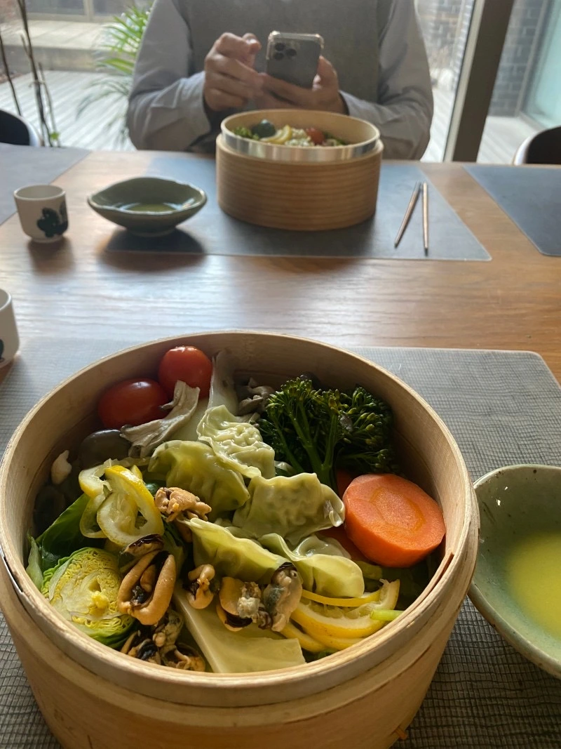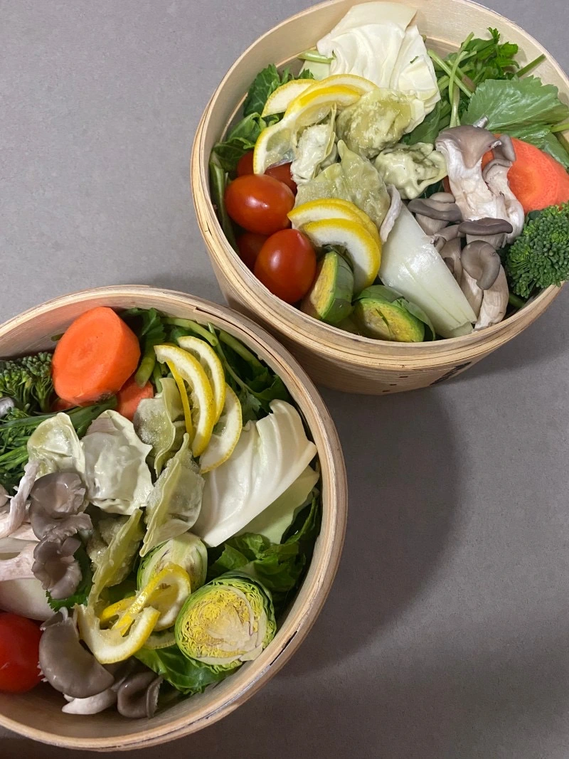 양배추, 미니양배추, 느타리버섯, 참나물, 대추토마토, 미니 브로콜리, 만두, 자숙 홍합을 쪘다. 물이 끓은 후 찜기를 올려 5분 쪘다. 다른 야채들은 다 괜찮았는데 미니 양배추가 단단한 편이었다.