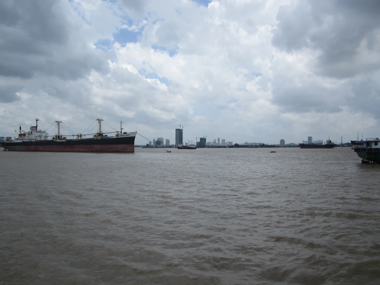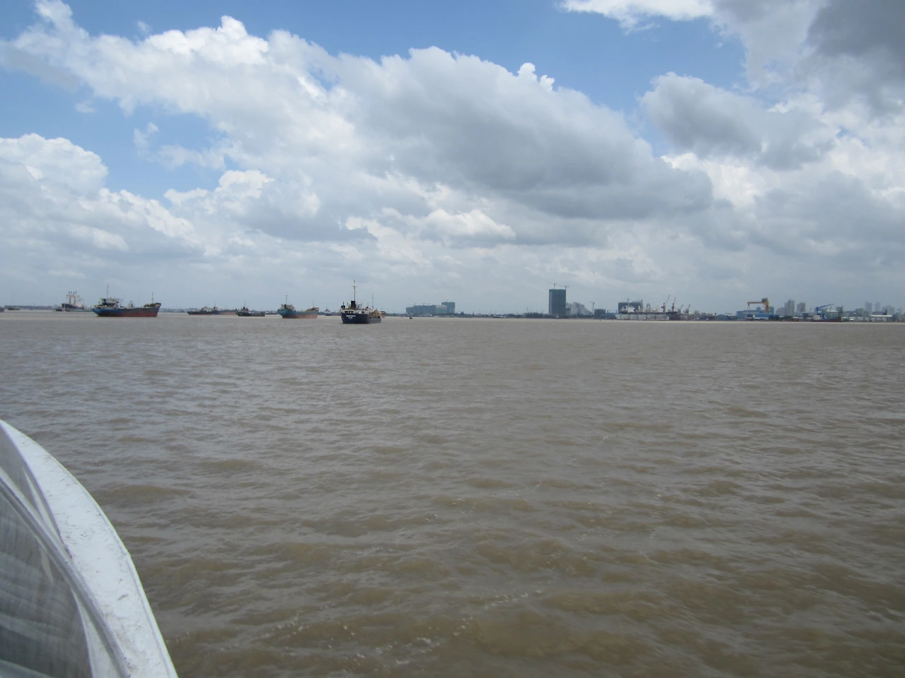 수많은 배들이 줄을 지어 상류로 오릅니다.