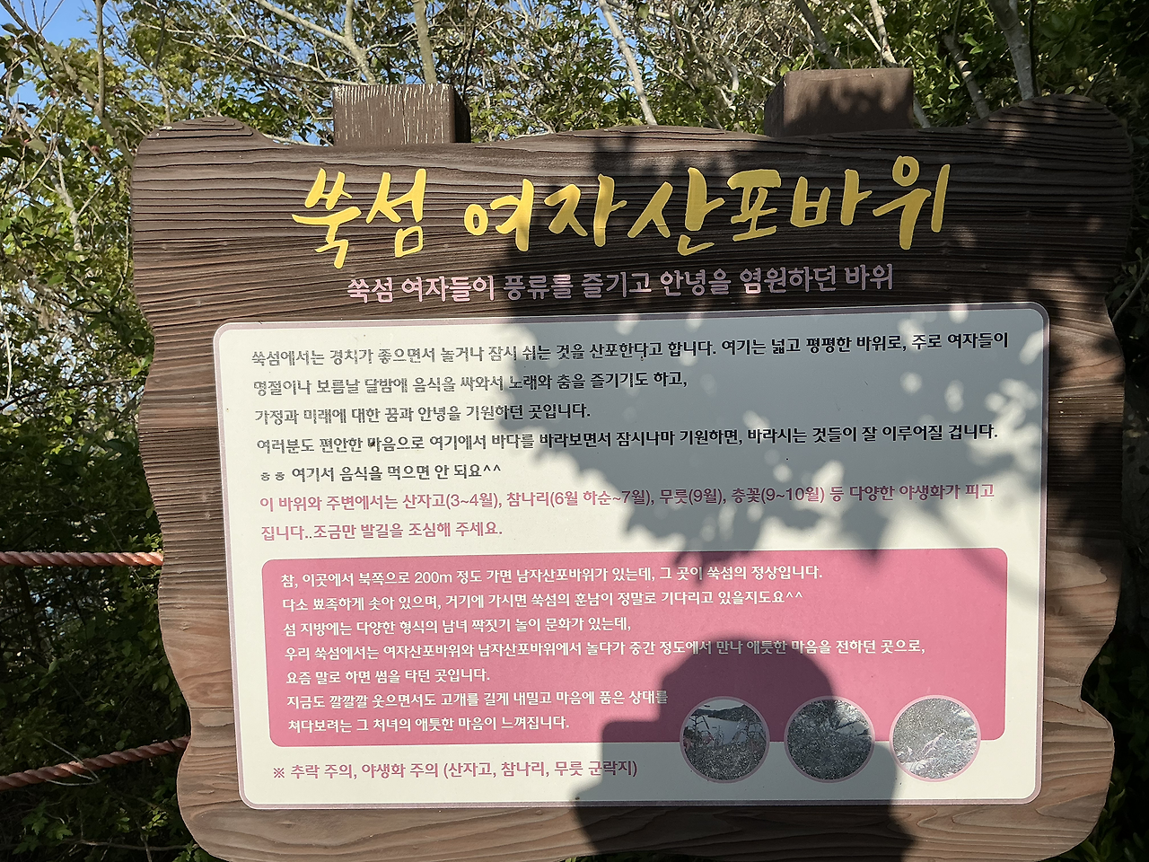 이곳에 내려가기 위해서는 비탈길을 조심해서 내려와야 하는 곳으로 쑥섬에서 민박을 하게 된다면 저녁 늦게까지 그곳에 머물다가 '수락도' 쪽으로 지는 석양을 조망하는 최고의 명소일 것입니다.