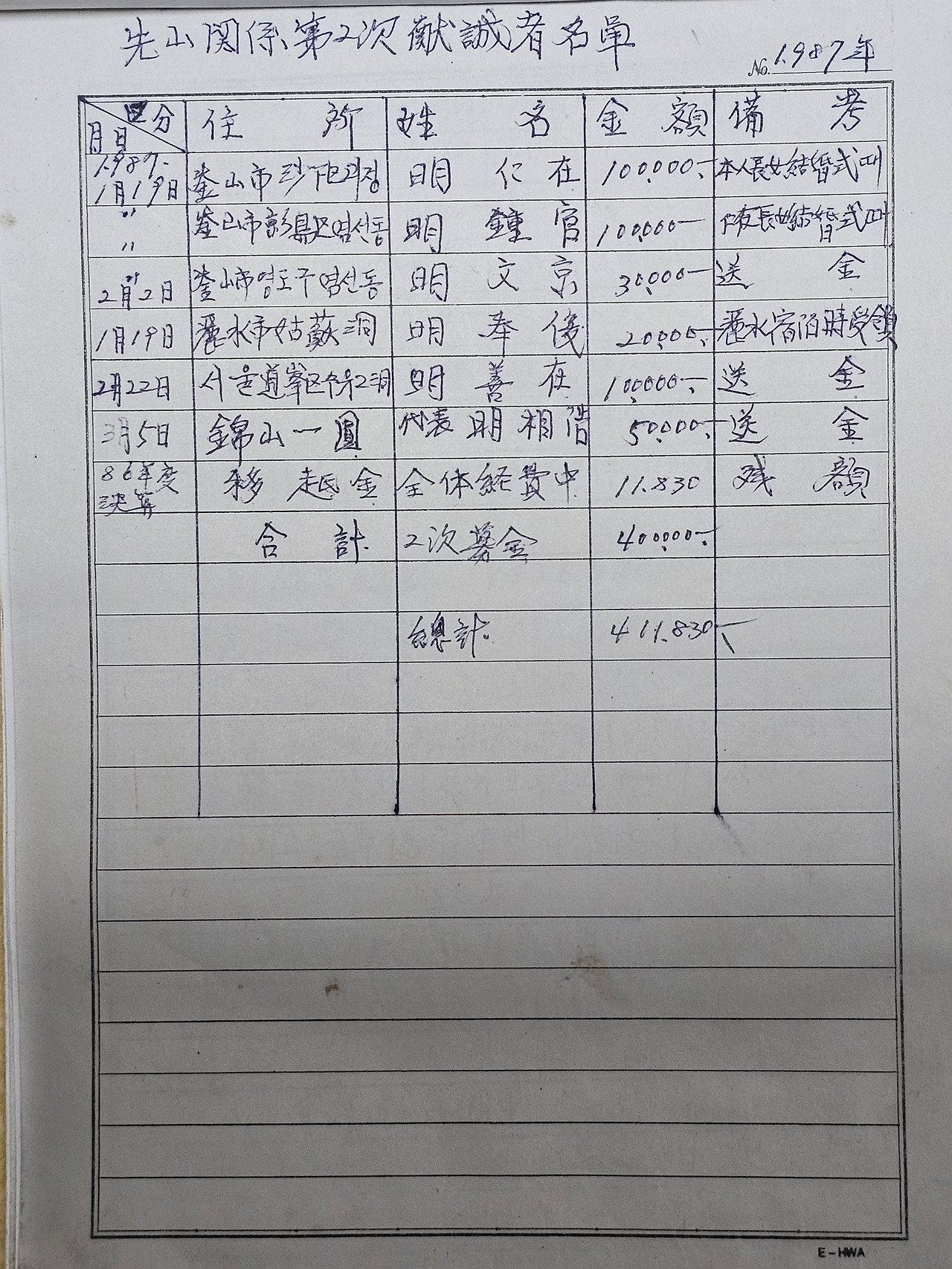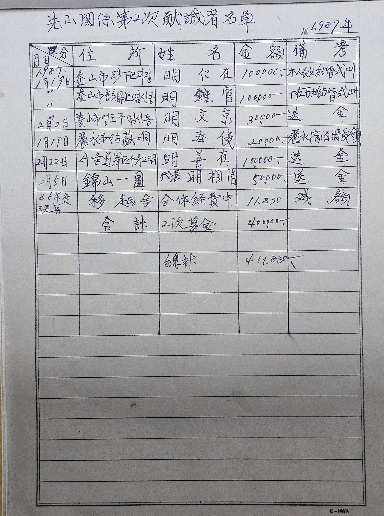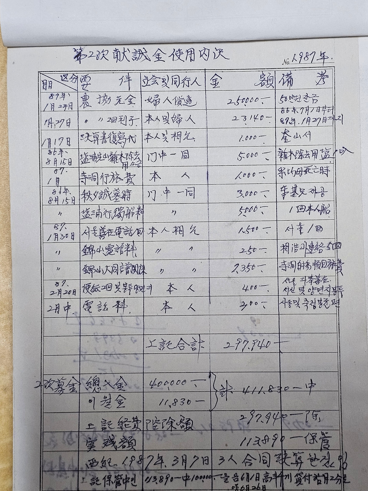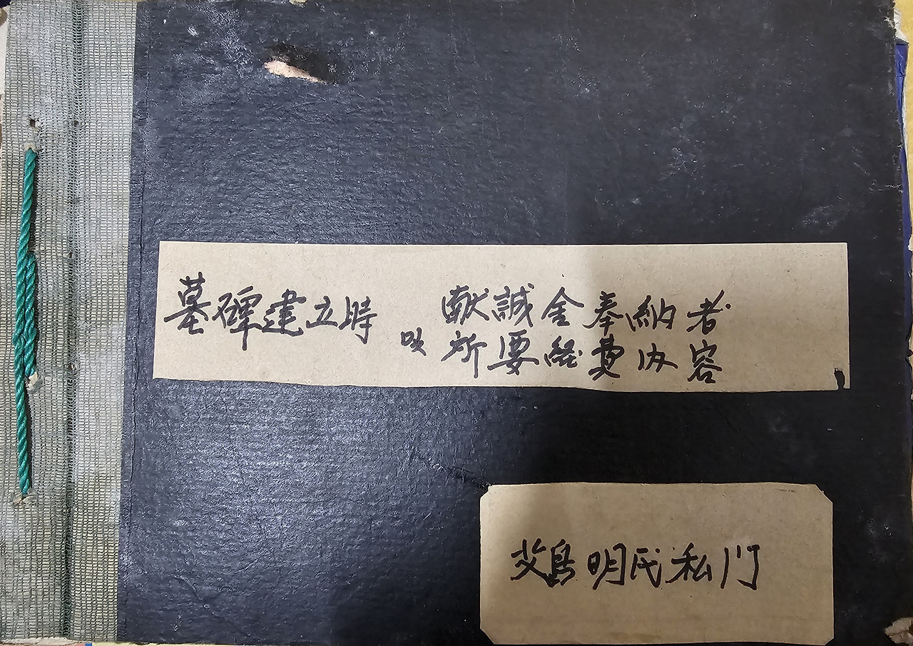 '日자 倫자' 할아버지의 선산에 세울 묘비 건립 비용을 마련하기 위해 각향 각지에 흩어져 있는 일가들에게 서신을 보내느라 작성한 서신의 초안과 그리고 모금에 참여한 일가들의 이름과 성금액 등을 세세하게 기록하여 두고 있었으며 그 전 과정을 위와 같이 표지를 만들어 편철을 해 두고 있었습니다.