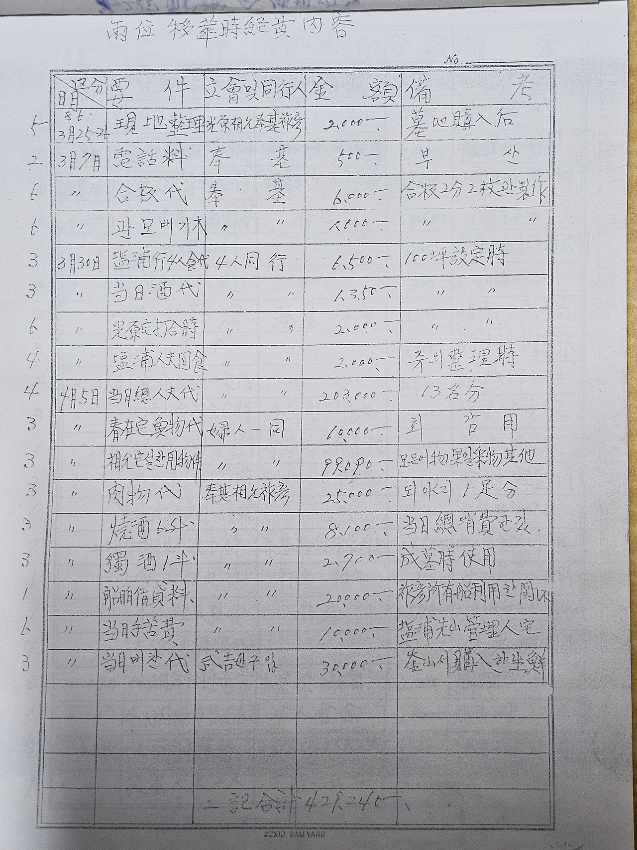 사용 내역을 살펴보면 묘비석을 제작하기 위해 많은 통화하고 묘이석을 뭍에서 나로도항으로 가져와서 다시 이를 사양도로 배로 운반하고 목도질을 하여서 가파른 비탈길을 한걸음 한걸음 옮겨가는 여정을 확인해 볼 수 있습니다.