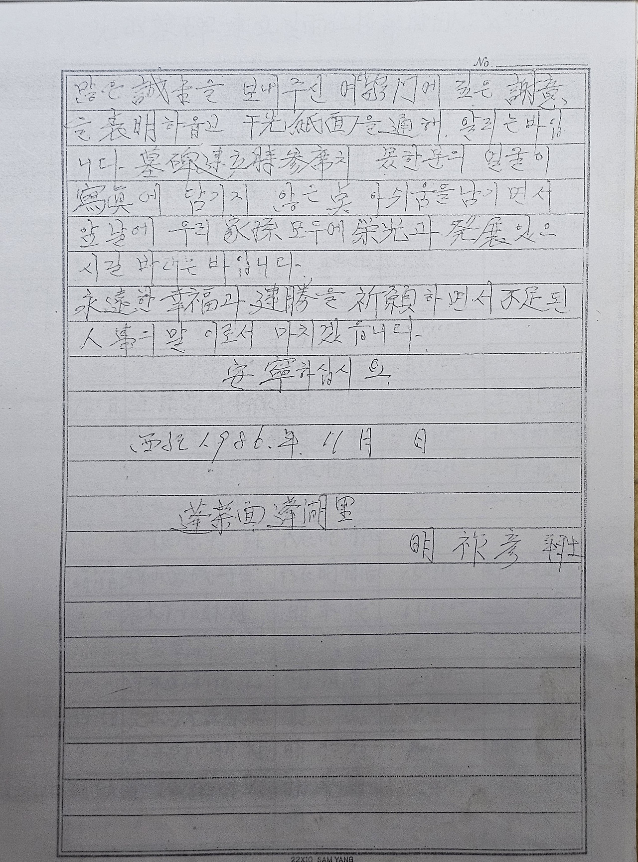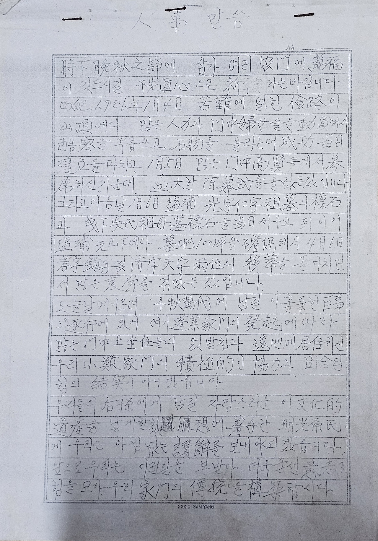 묘지 제막을 하고 보낸 감사인사의 필사본입니다.