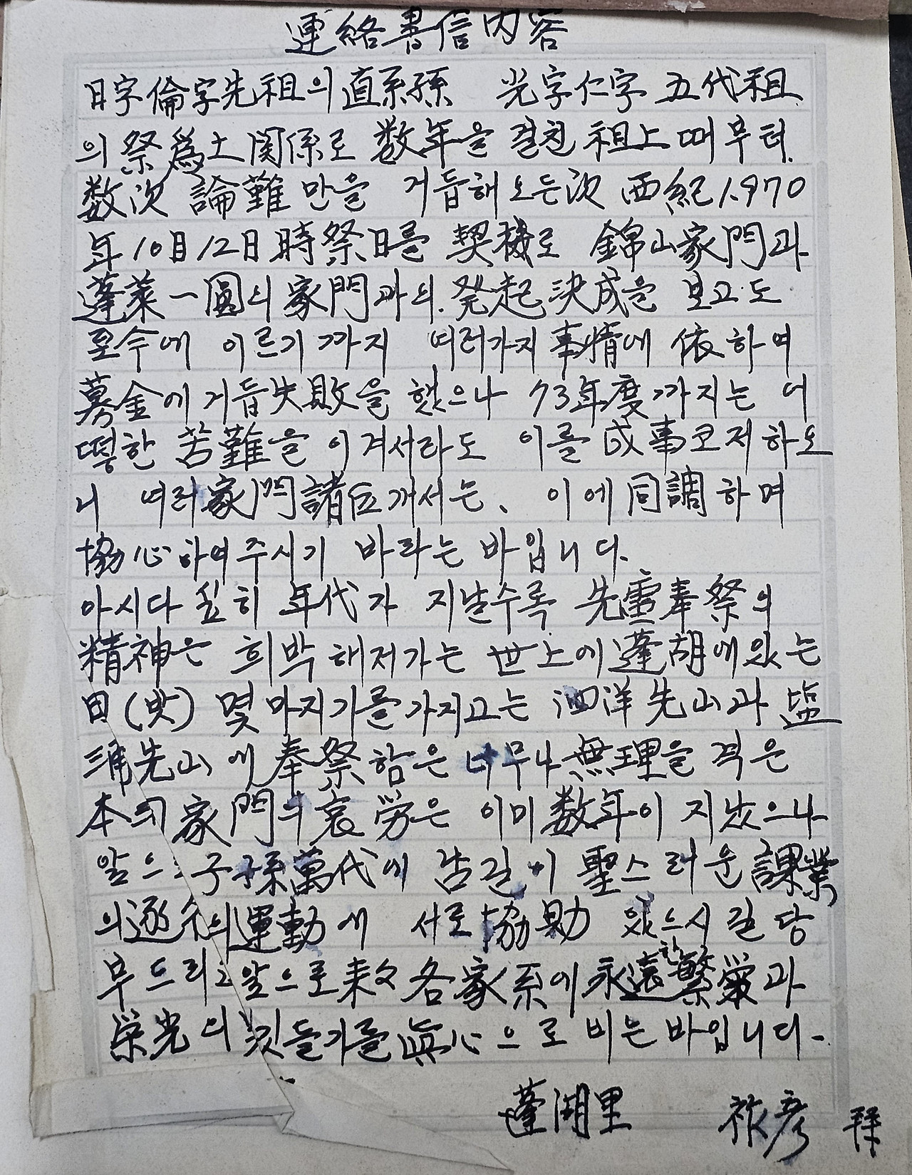 이 서신은 지금과 같이 단톡방이 있으면 전국의 모든 종친들에게 일시에 보낼 수 있었겠지만 당시에는 모두 편지로 주고 받던 시절이라 모두 필사를 해서 연락이 가능한 모든 분들에게 동참을 호소를 하기 위해 하나하나 보냈을 것이니 얼마나 공을 들였는지를 알 수가 있을 거 같습니다.