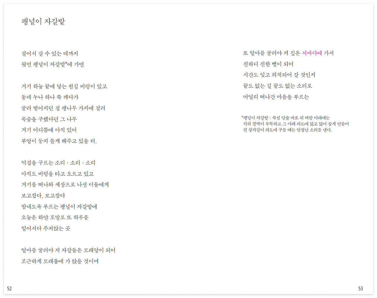 '자갈'이라는 말은 쑥섬에서 불리는 말이지만 이것은 실은 '몽돌'이라고 할 수 있습니다. 그러니 다시 부르자면 '팽널이/평널이 몽돌밭'이라고 할 수 있습니다.