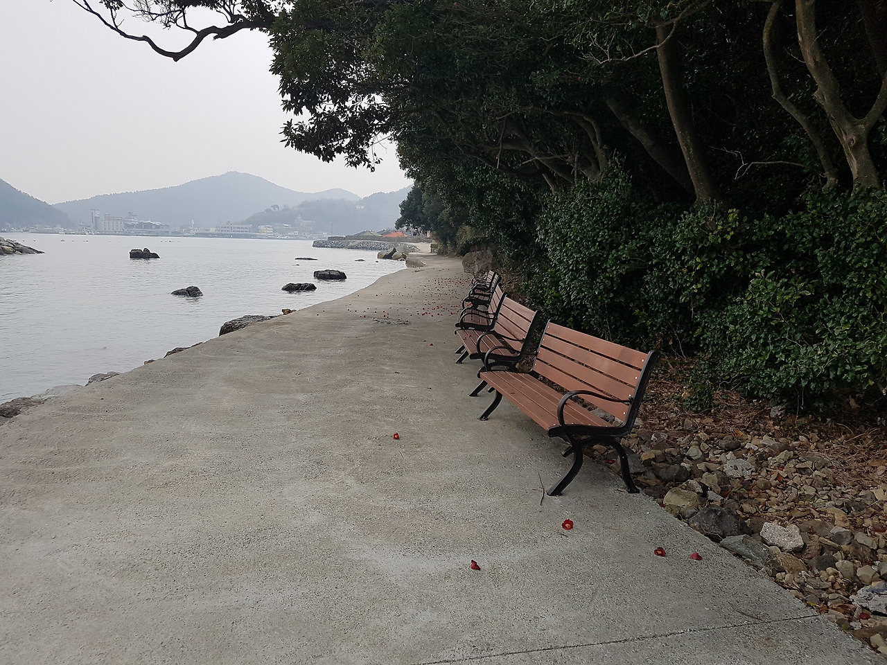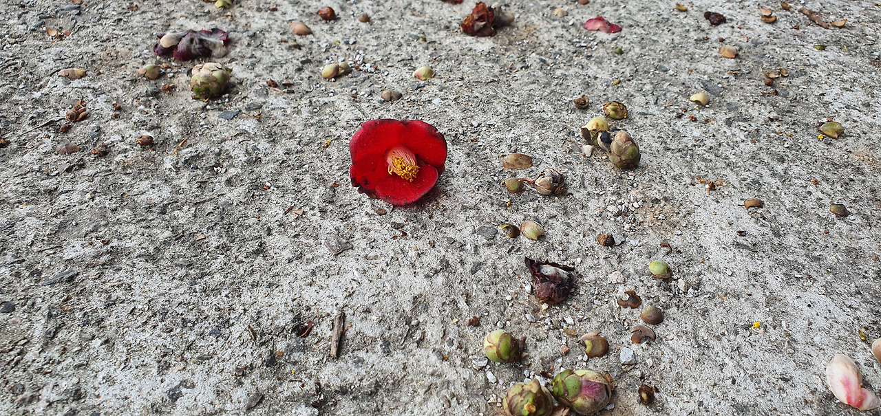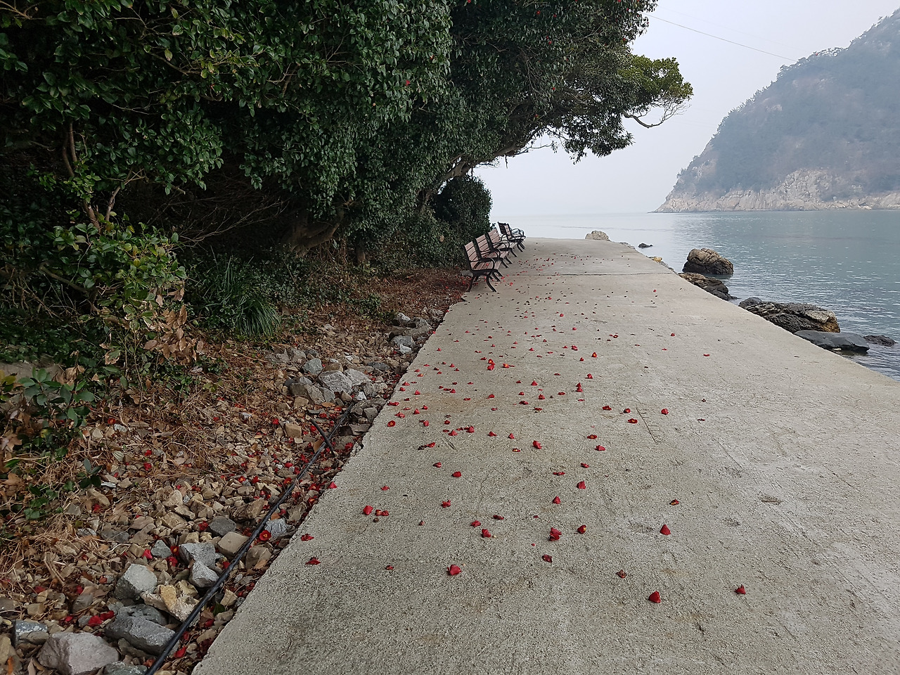 발길에 피다가 떨어진 애동백 꽃들이 발에 밟히고 있었다.