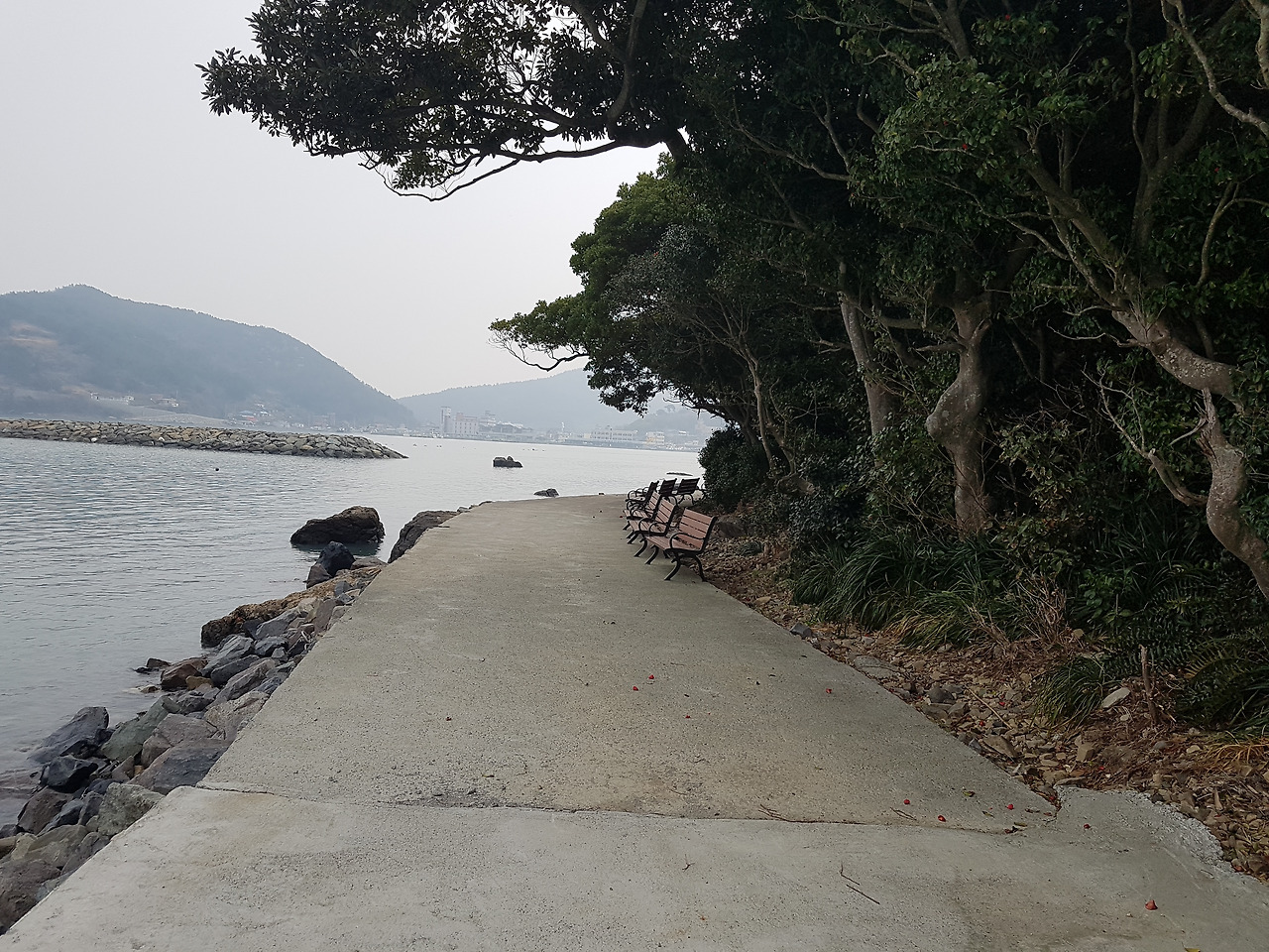 왼쪽은 바닷물이 오른쪽으로는 '초분골/동백숲'이었다. 길은 좁으나마 모래를 얹어 그나마 평탄한 길이었다.