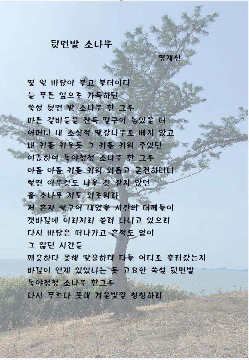 이 시는 1996년도 울진에서 시작활동을 하던 때 쓴 시이며 2021년도 제4 시집 ’쑥섬 이야기‘에 실렸다. 여기 소나무는 쑥섬의 다른 언덕에 있는 소나무 사진이며 이 시화는 2024년 여름에 쑥섬에서 개인 걸개시화전을 할 때 걸었던 시화이다.