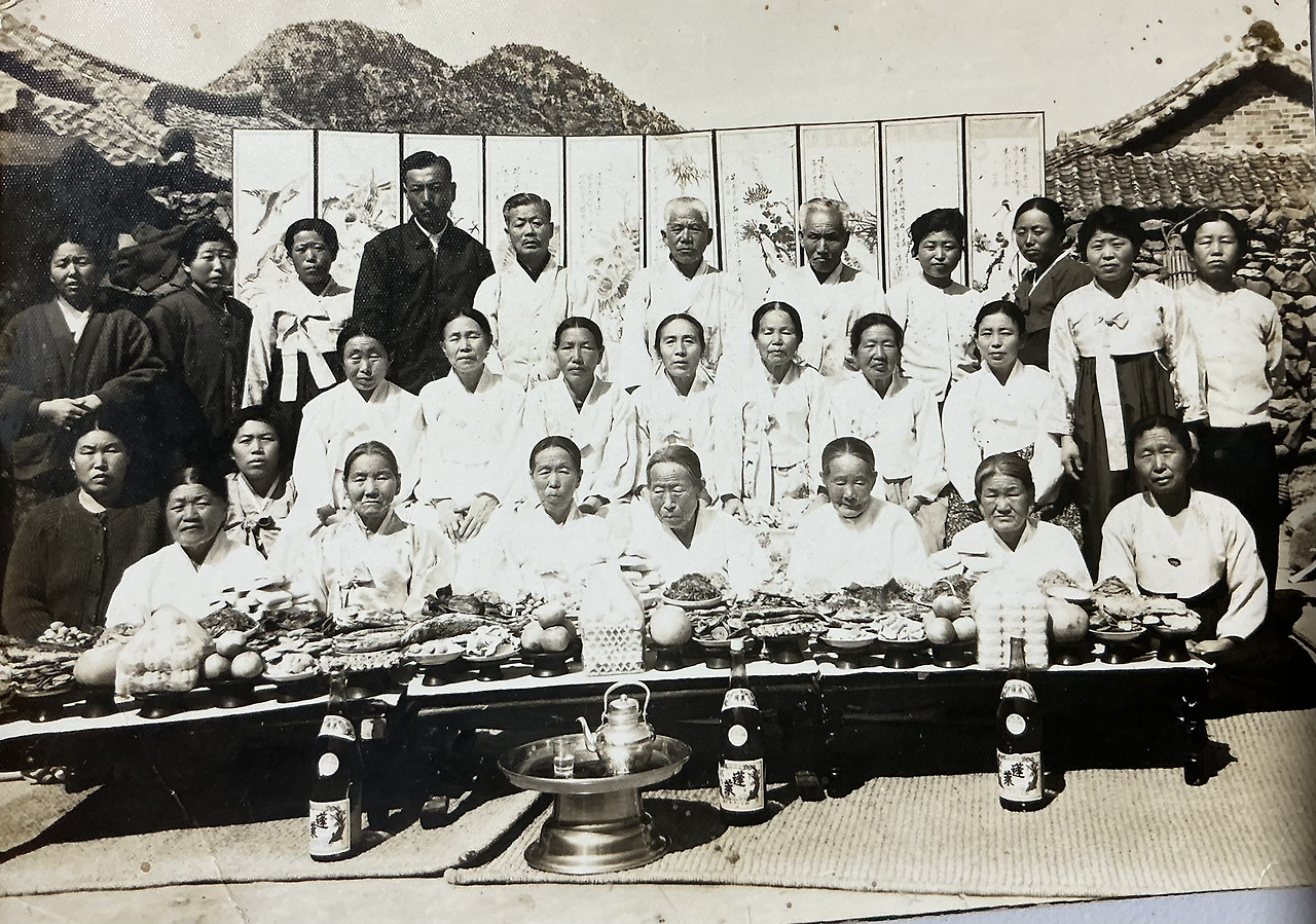 우선은 20 가구의 나이 많은 어른들과 당시에 젊은 새댁들이 함께 사진 속에 등장하고 있다는 사실입니다. 작은 쑥섬이라는 공간에서 집성촌을 이루며 명씨 집안 어른들을 모시기 위해 젊은 새댁들과 어른들이 함께 음식을 장만하고 옷을 단정하게 차려입고 나와서 정월에 사진을 찍은 것입니다.
