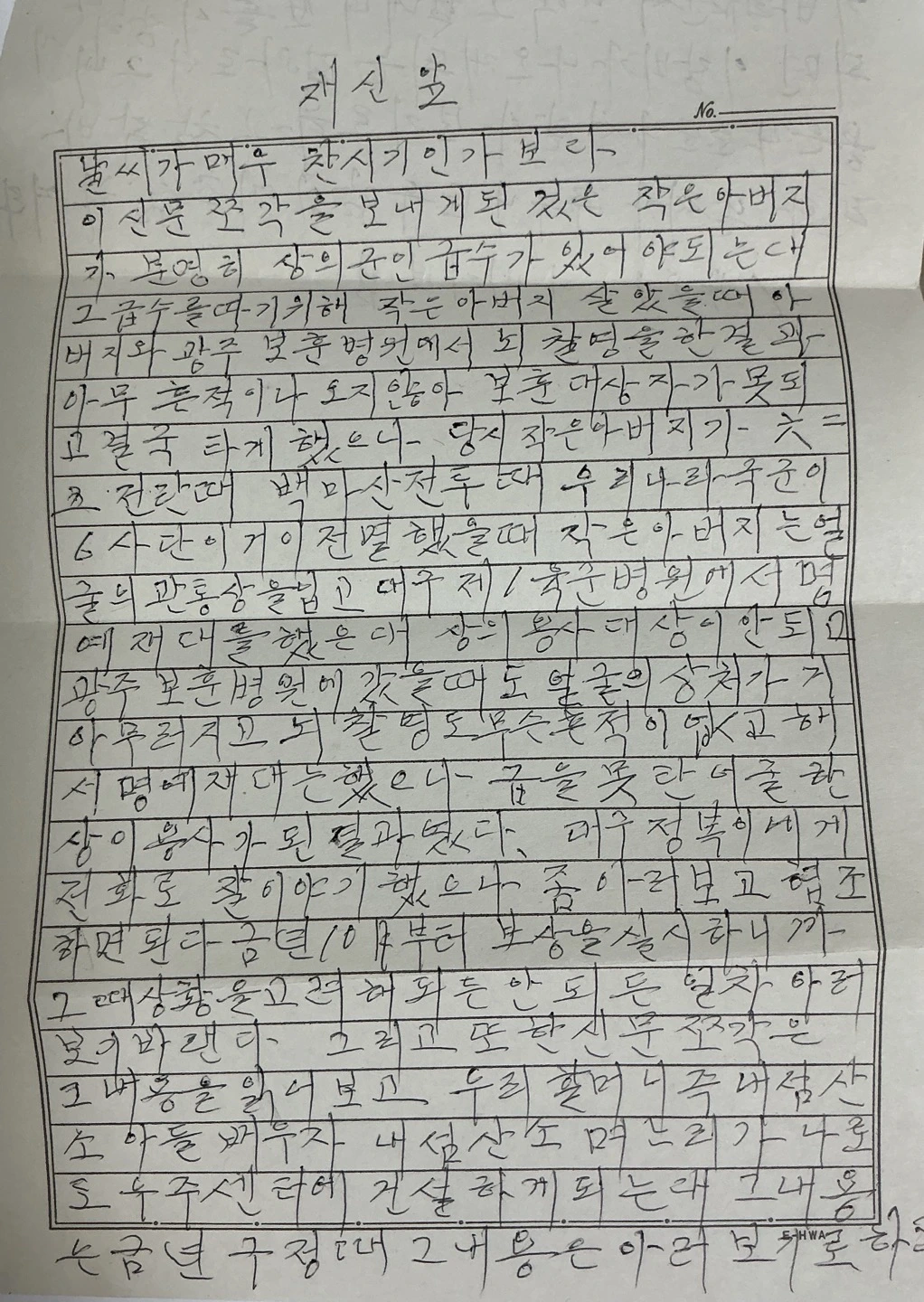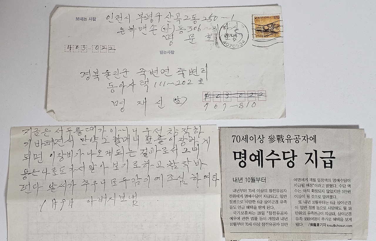 작은아버지가 돌아가시고서야 70세 이상 참전유공자에게 명예수당이라는 명목으로 연금혜택을 받게 된다는 신문기사를 보고서는 어떻게든 이번에는 인정을 받도록 해야 한다는 내용의 편지를 보내오셨던 것입니다.