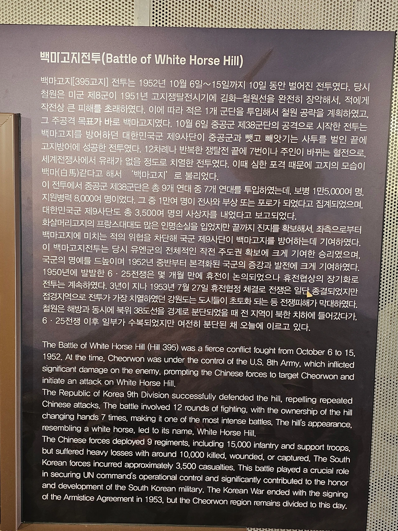 백마고지 전투는 1952년 10월 강원도 철원에서 벌어진 전투로, 국군 제9사단이 중공군과 치열한 고지 쟁탈전을 벌인 전투였습니다. 백마고지(395 고지)는 철원평야를 감제할 수 있는 전략적 요충지였기에 국군이 중공군의 공격을 12차례나 격퇴하며 끝까지 방어에 성공한 전투였으며,
