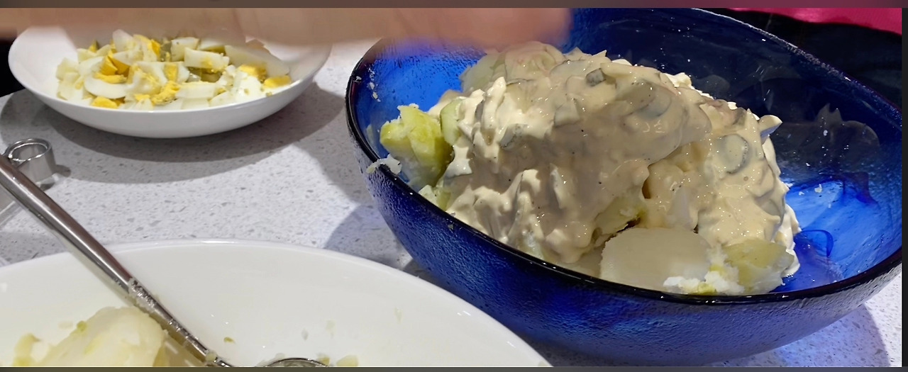두 개의 볼에 담은 것은 이유가 있다. 두 가지 종류(마른감자 샐러드, 젖은감자 샐러드)의 샐러드를 하기 위해서였다. 안드레아의 냉장고에는 각 샐러드의 소스 레시피를 정리한 메모기 꽂혀 있었다.