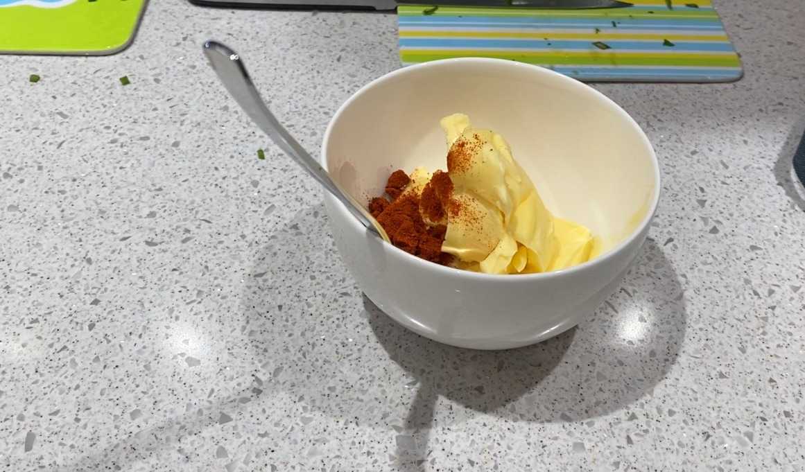 안드레아가 직접 옥상에서 기른 애플민트, 스위트바질을 따서 버터에 들어갈 만큼만 잘게 썰어놓았다. 슈퍼에서 산 녹색 부추도 잘게 썰었다. 붉은색은 파프리카 분말을 쓰기로 했다. 거기에 생마늘 두세 쪽을 까서 다져놓았다.