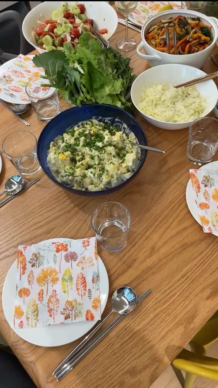 목요일 밤 카톡 방에서 그녀는 우리를 불렀다. 코크쿠어스를 일요일 2시에 자신의 집에서 열겠다는 것이다. 요리는 독일인들이 집밥으로 많이 해서 먹는 샐러드였다. Kartoffelsalat, Griecher Salat, Krautsalat 그리고 Kräuterbutter. 안드레아는 재료는 본인이 준비한다며 가져온다면 다음과 같은 것을 가져오라고 주문했다. “배고픔, 좋은 분위기, 쌈장…Sauce für Fleisch, Fleischzange, 무의 조리법 “이었다. 그녀의 후모아(Humor)는 사람의 마음을 춤추게 한다.