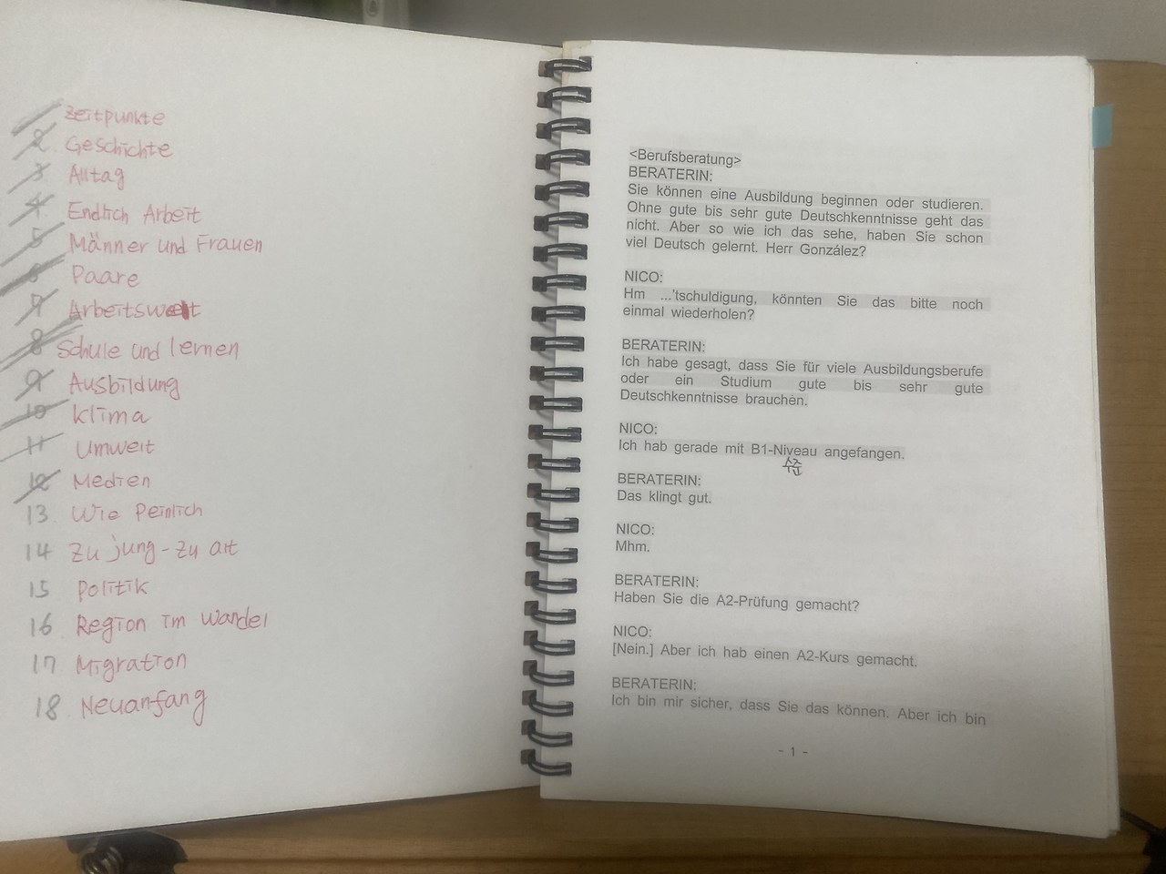 B1는 좀 더 난이도가 높다. 역사(Geschichte), 여성과 남성(Manner und Frauen), 기후(Klima), 환경(Umwelt), 정치(Politik), 이민(Migration) 등 최근 사회에서 이슈로 다루지는 주제들이다.